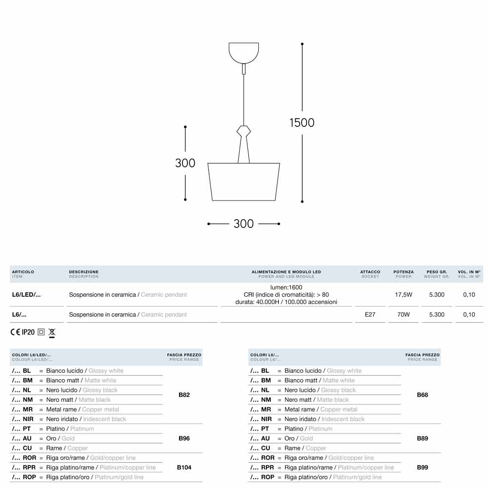 I Lustri 6 ist in verschiedenen Ausführungen und mit Standard E27-Glühbirnenfassung oder LED-Licht erhältlich.