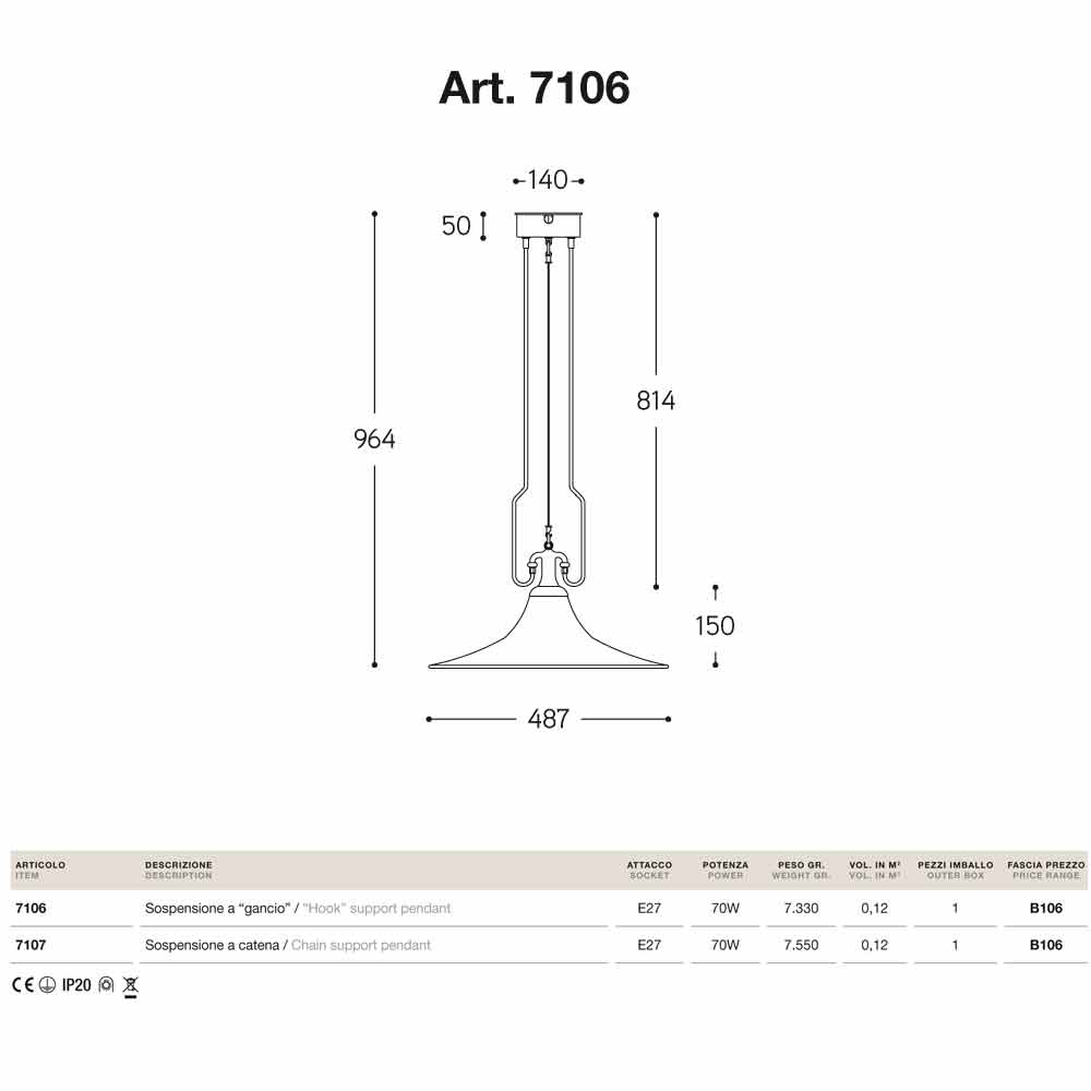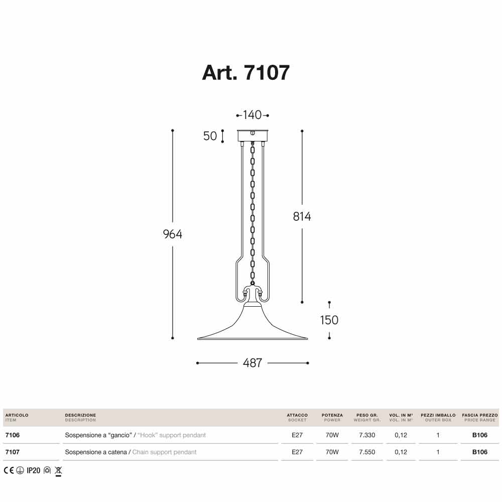 Sockel E27 Leistung 70 W Gewicht con gancio 7330 gr, con catena 7550 gr IP 20 Glühbirne nicht enthalten