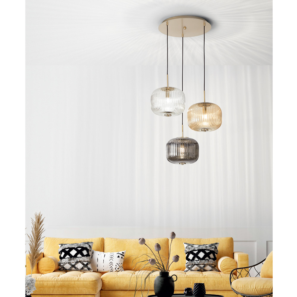 Pendelleuchte mit goldfarbener Metallstruktur und drei gestreiften farbigen Diffusoren aus mundgeblasenem Glas. Ein Design mit eleganten und raffinierten Formen , die dem Raum einen edlen Geschmack verleihen und seine Ästhetik dank einer exklusiven Note und einer raffinierten und innovativen Ästhetik bereichern. Die drei wundervollen Farben, die die zeitlose Eleganz des mundgeblasenen Glases unterstreichen, verleihen dem endgültigen Erscheinungsbild des Produkts seine wahrhaft zarte Essenz und seine starke zeitgenössische Persönlichkeit und geben so einer ebenso funktionalen wie ästhetisch beeindruckenden und starken Einrichtungslösung Leben Erkennbare Wirkung. .