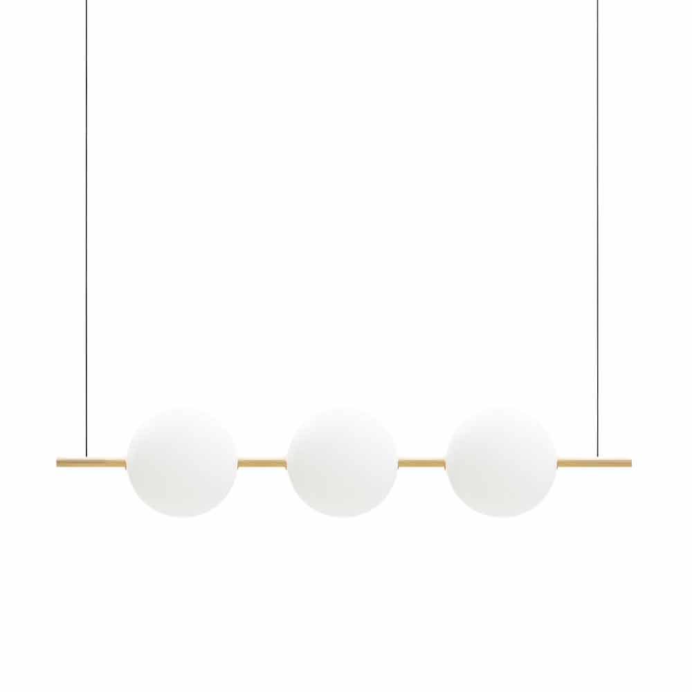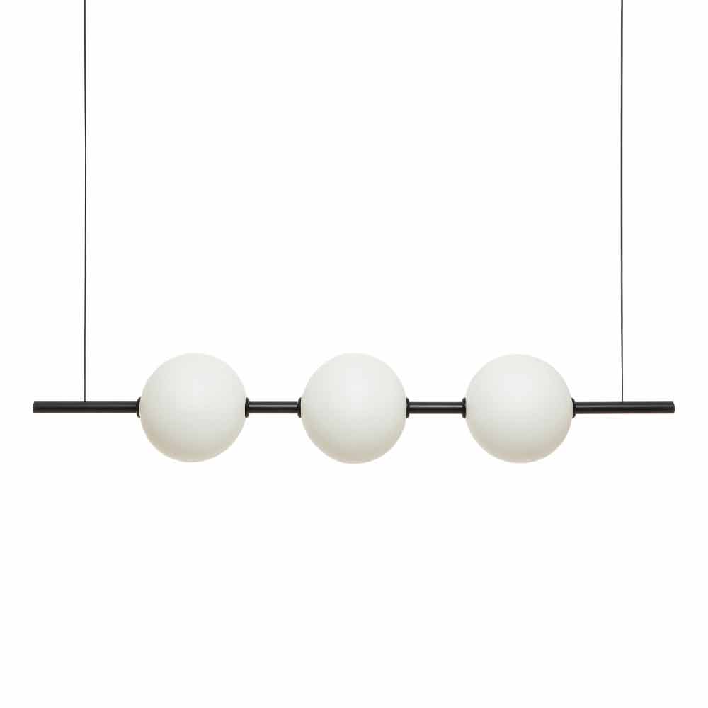 Pendelleuchte aus schwarzem oder gebürstetem Messing mit drei Borosilikatglaskugeln, hergestellt in Italien.