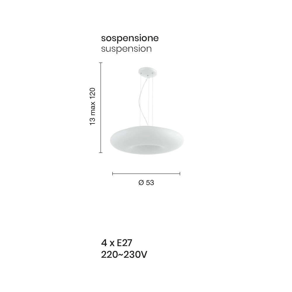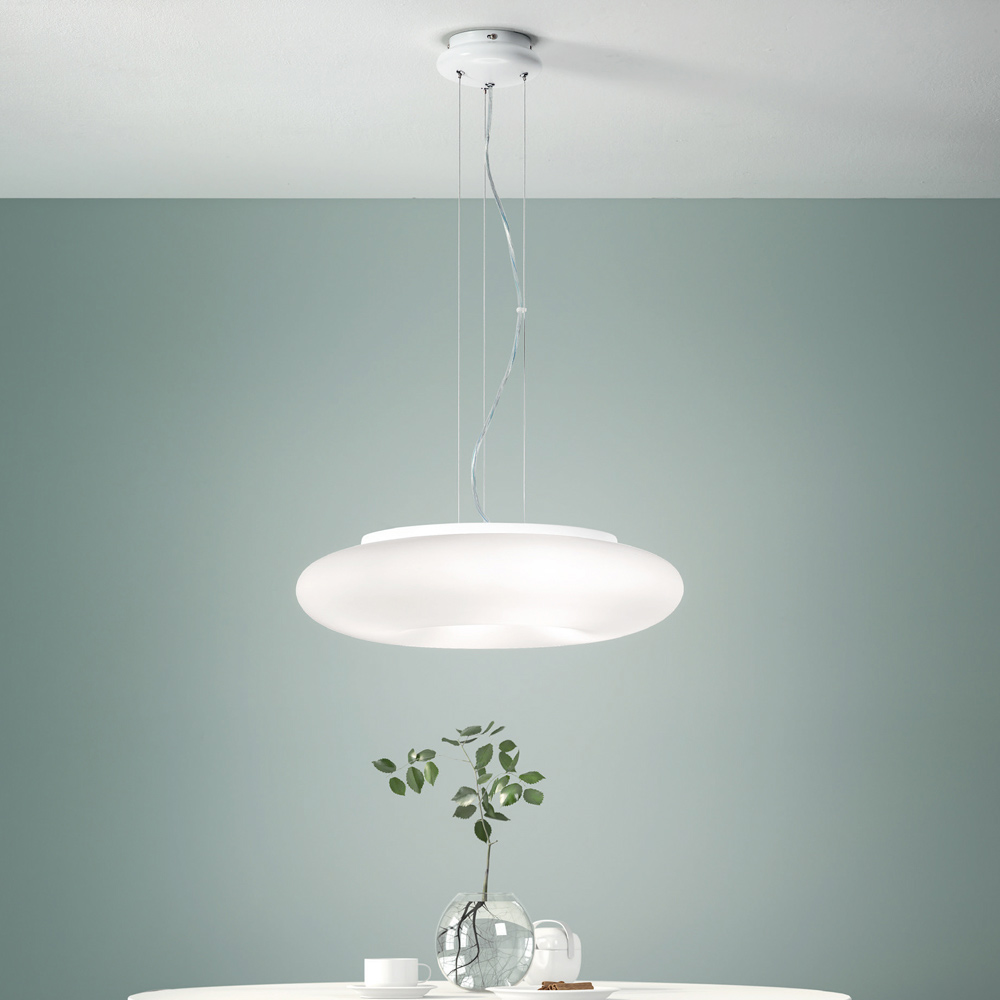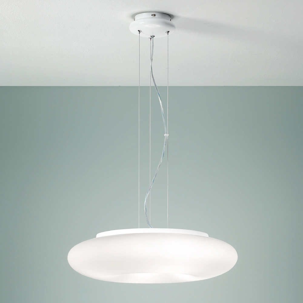 Pendelleuchte mit Struktur aus verchromtem Metall und weißem Diffusor aus geblasenem, geätztem Glas, komplett mit längenverstellbaren Kabeln. Weiche Formen und geschwungene Linien verleihen einer hochwertigen Einrichtungslösung Leben, die Wohnräume wie Esszimmer, Wohnzimmer oder Schlafzimmer durch eine starke moderne Persönlichkeit und einen nüchternen und eleganten Charakter bereichern kann. Seine raffinierte Ästhetik wird durch die Wahl des Einsatzes von mundgeblasenem Glas unterstrichen und einzigartig gemacht, einem raffinierten Material, das die Exklusivität des Produkts unterstreicht und eine besonders funktionale Beleuchtung ermöglicht .