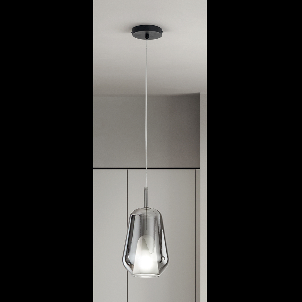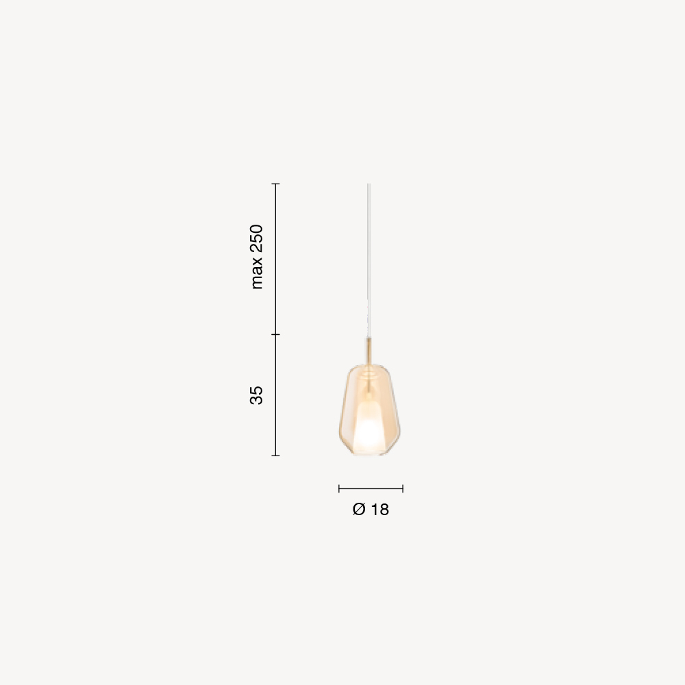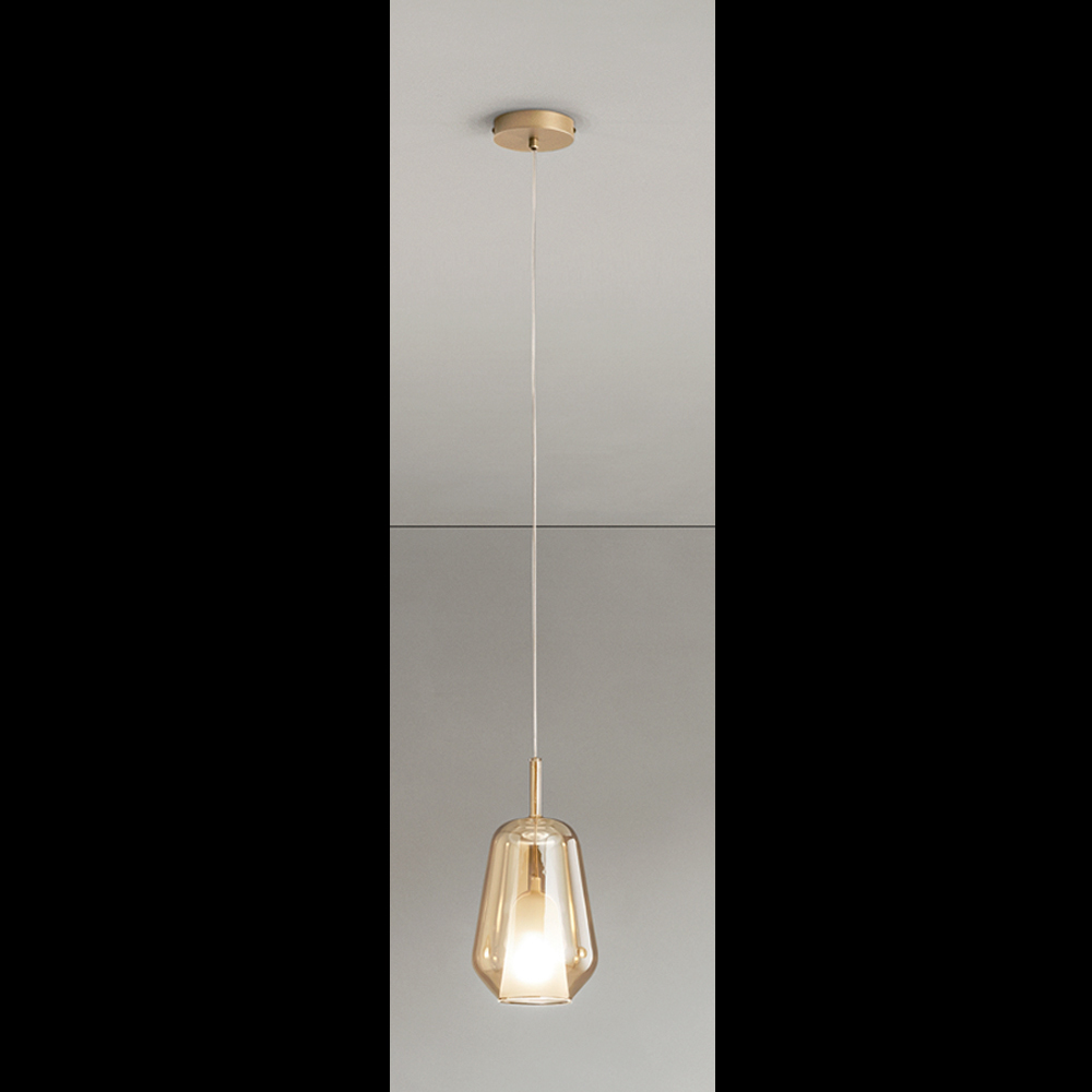 Lampe mit Metall -Deckensockel und Diffusor aus geblasenem Glas , gekennzeichnet durch eine Doppelschicht: innen aus satiniertem Glas und außen aus farbigem Glas . Kappe aus Polymermaterial zur Stabilisierung des Kabels in einer zentralen Position. Verstellbares Kabel.