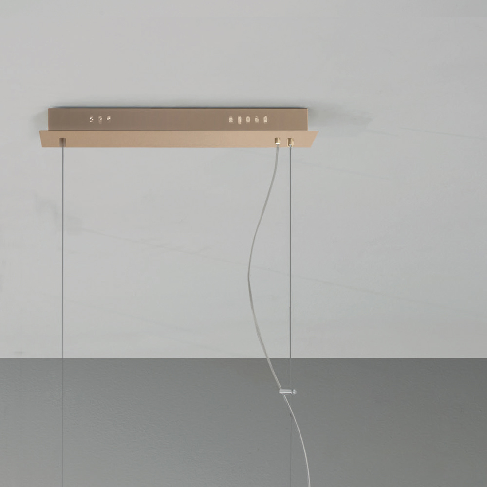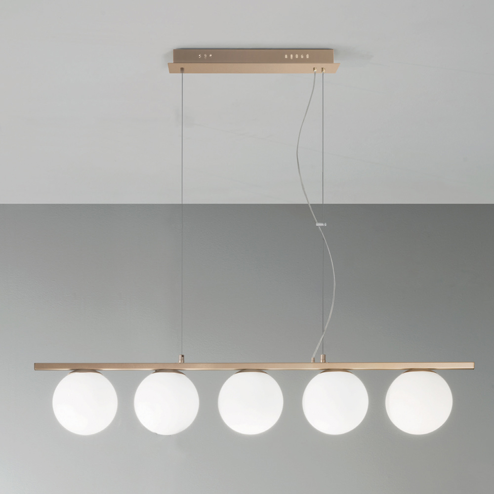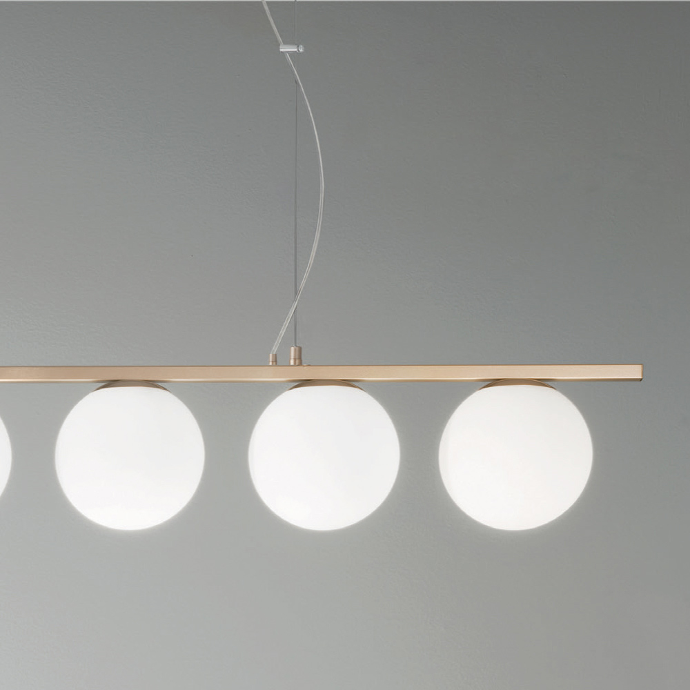 Pendelleuchte mit goldfarbener Metallstruktur und kugelförmigen Diffusoren aus mundgeblasenem Glas, komplett mit höhenverstellbaren Kabeln. Aus der perfekten Kombination des modernen Hauchs von Metall und der zeitlosen Eleganz von mundgeblasenem Glas entsteht eine originelle und raffinierte Einrichtungslösung , die in der Lage ist, in modernen Wohnumgebungen den Mittelpunkt der Aufmerksamkeit zu erobern. Seine Struktur entwickelt sich auf einer einzigen Linie, was ihn zu einer besonders geeigneten Lösung für die Beleuchtung Ihres Tisches im Esszimmer oder in der Küche macht.