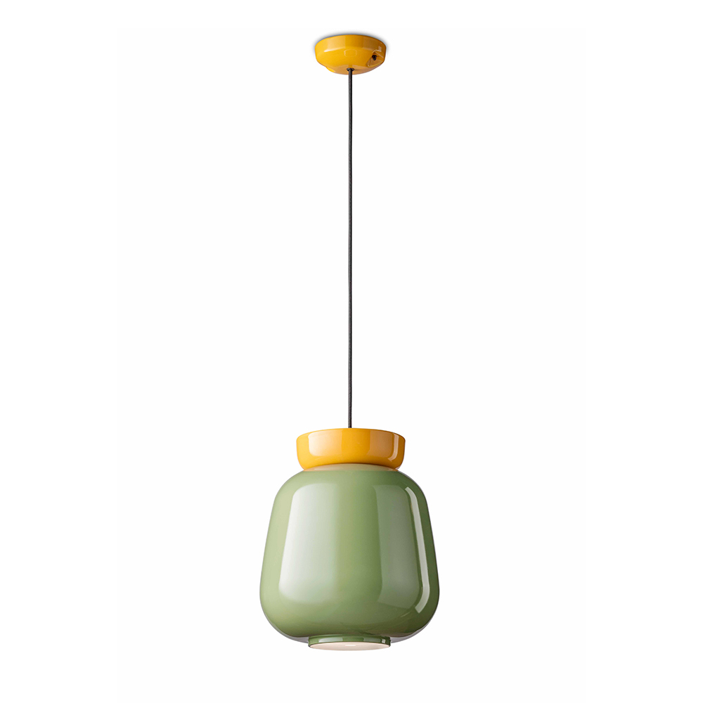 Hängeleuchte aus farbiger Keramik , lackiertem Glasdiffusor und ummanteltem Baumwollkabel, vollständig in Italien hergestellt.