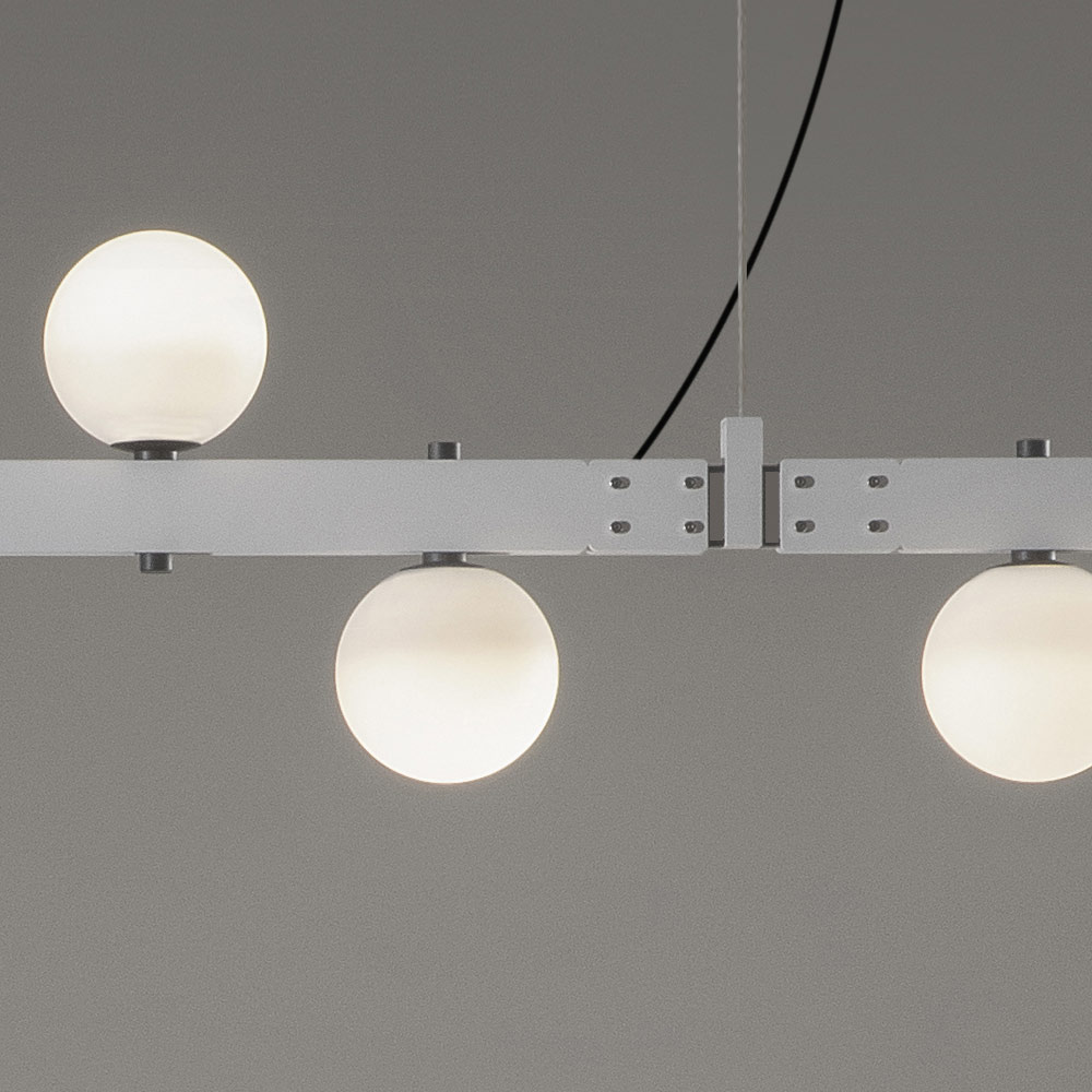 Die tragenden Stangen erinnern an die Ingenieurbauwerke der Vergangenheit und die elektrifizierten modularen Strukturen tragen Lichtkörper ( mundgeblasene Glaskugeln und Strahler ), die in Quantität und freier Anordnung ohne Verwendung von Stromkabeln für maximale Ausdrucksfreiheit platziert werden können. .