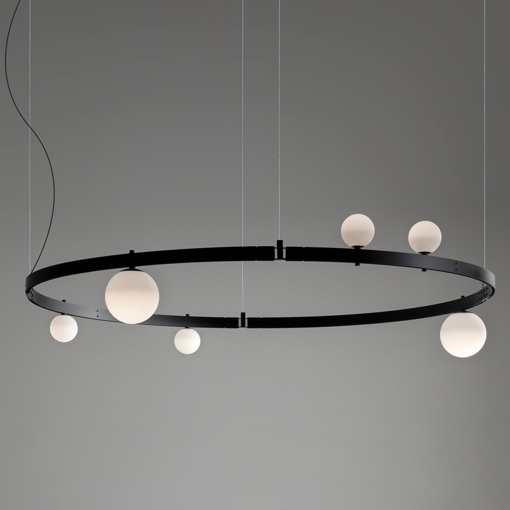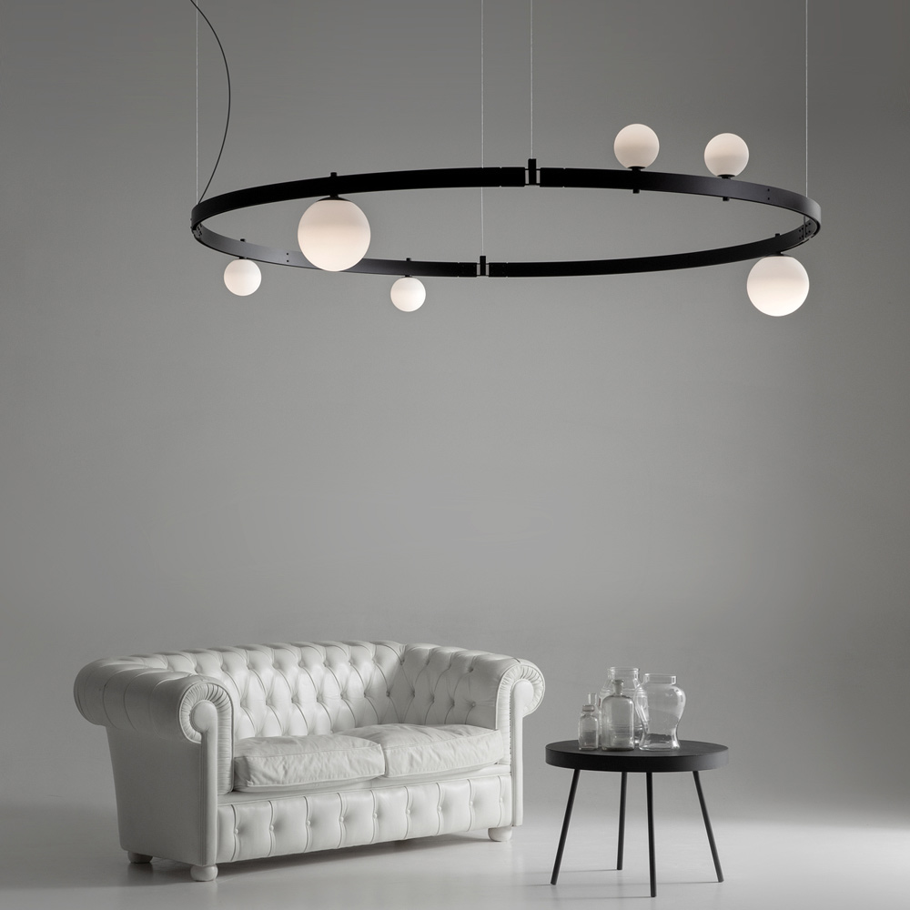 Die kreisförmige Tragstange erinnert an die Ingenieurbauwerke der Vergangenheit und die elektrifizierten modularen Strukturen tragen Lichtkörper ( geblasene Glaskugeln in zwei verschiedenen Größen), die in Quantität und freier Anordnung ohne Verwendung von Stromkabeln platziert werden können, für maximale Freiheit von Ausdruck.