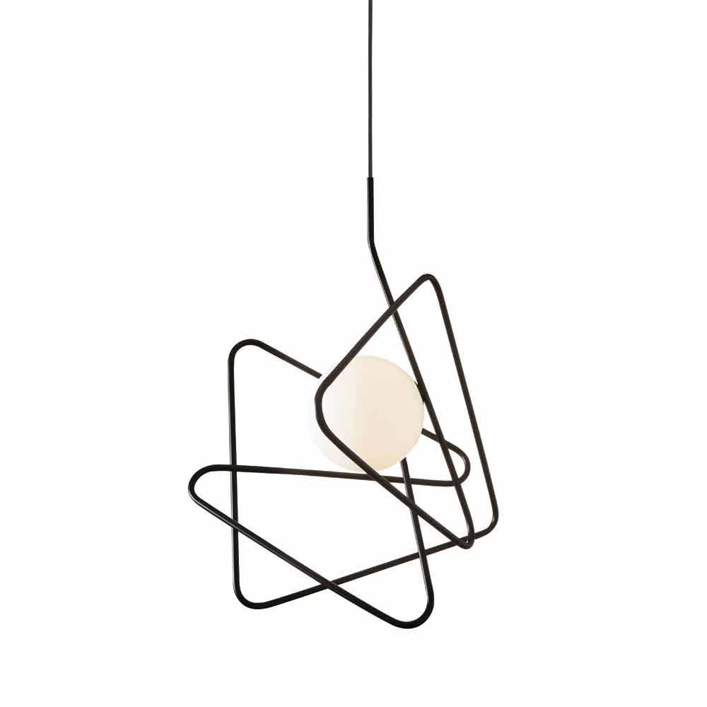 Hängeleuchte aus pulverbeschichtetem Stahl. Das 4 Meter lange Stahlrohr ist von Hand geformt und beschreibt Rundungen, die den weißen Borosilikatdiffusor umschließen.