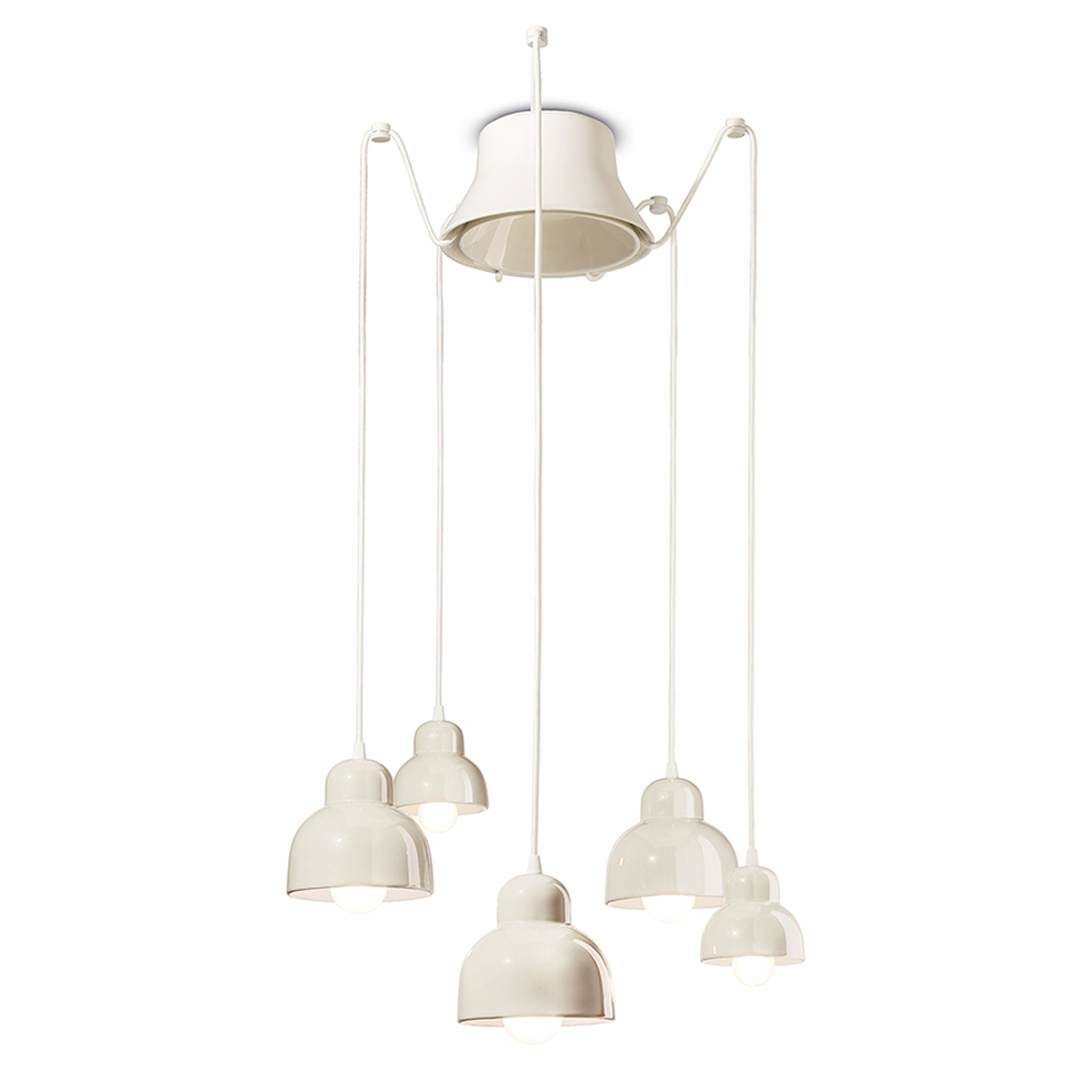 Diese Keramik-Pendelleuchte ist ein bezauberndes Beispiel für zeitgenössisches, von der Tradition inspiriertes Design . Ihre fünf Pendelleuchten strahlen in unterschiedlichen Höhen, wie ein visueller Tanz aus Formen und Lichtern im Raum.