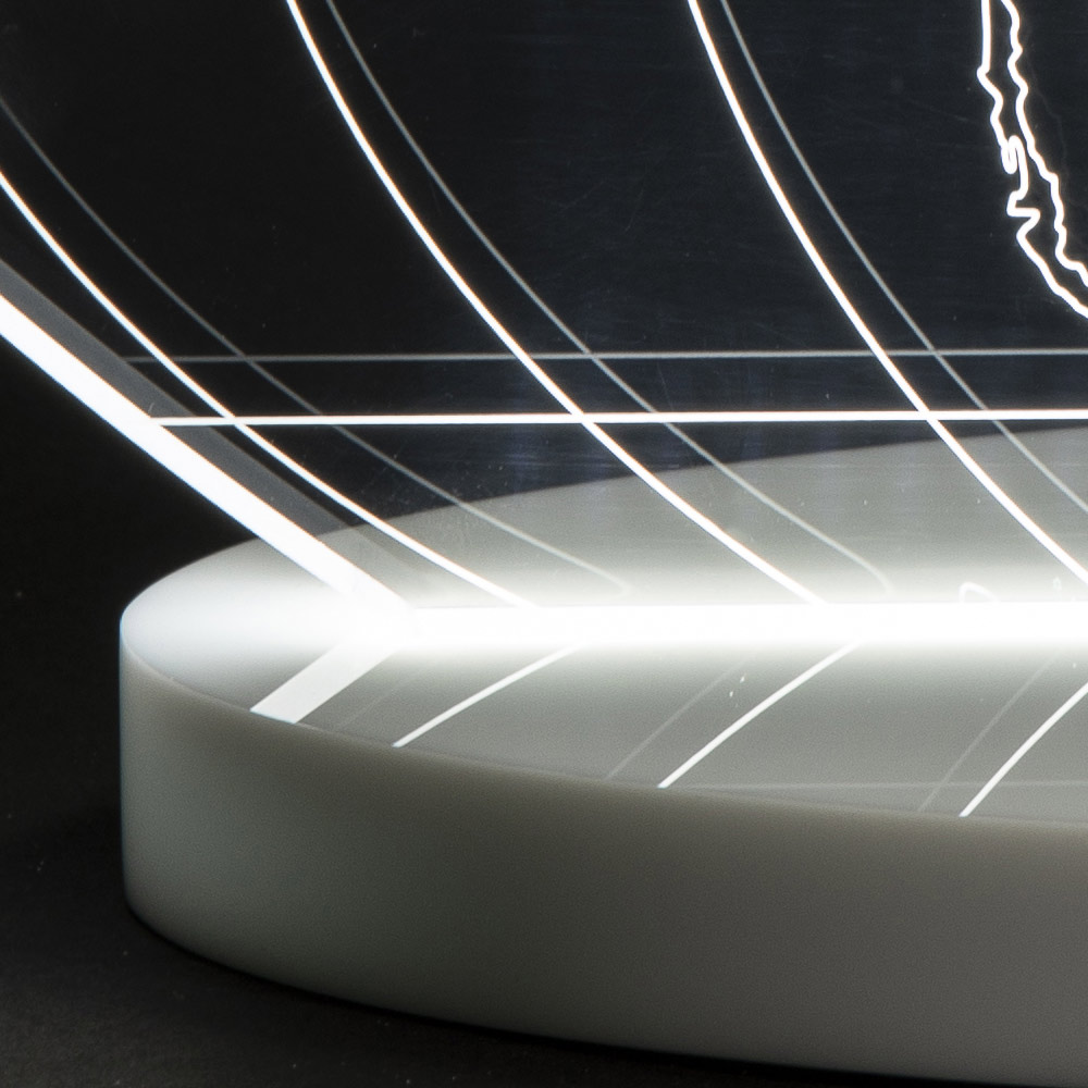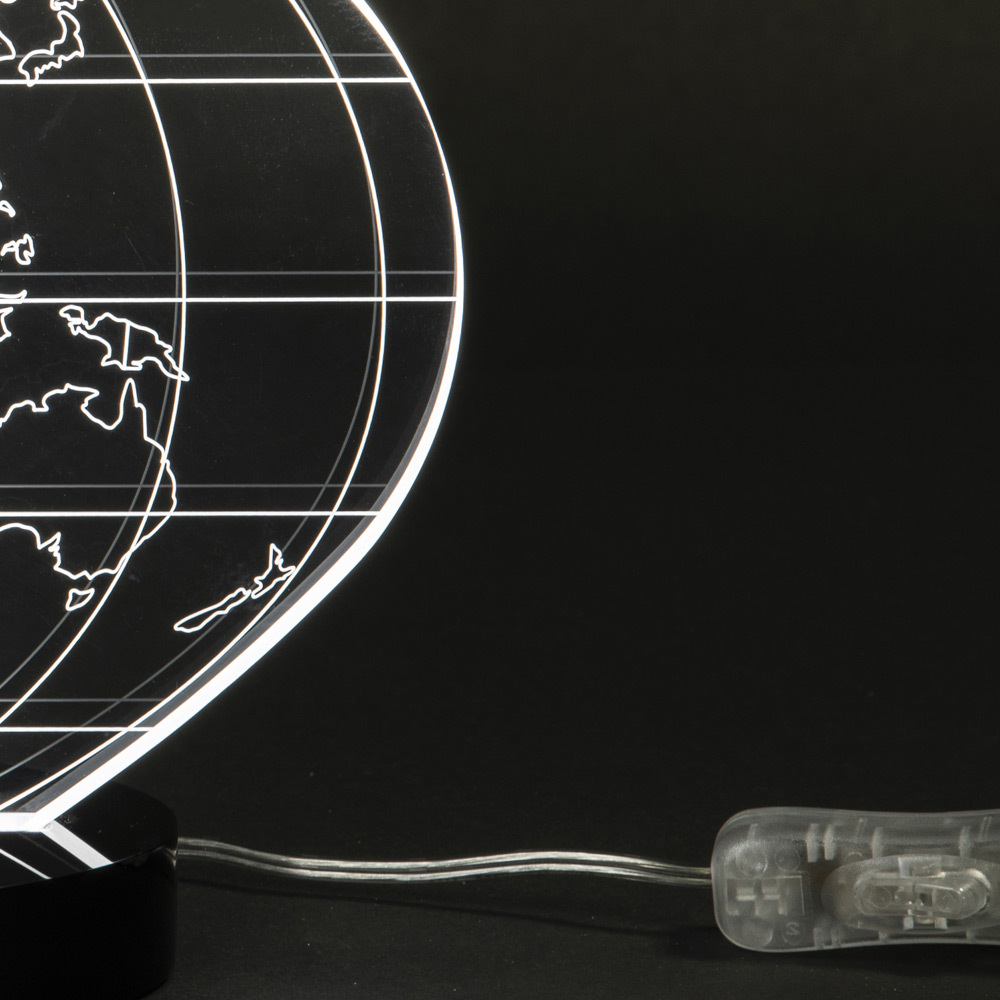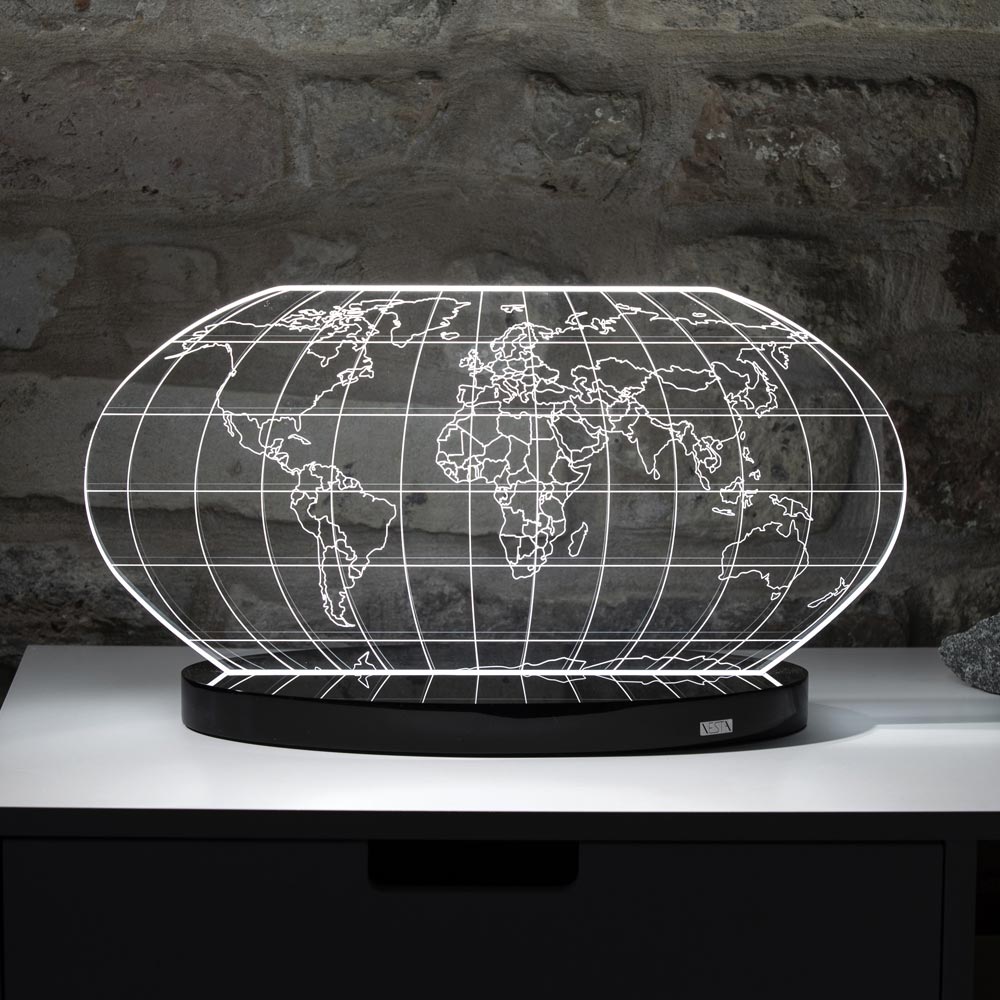 Tischlampe aus transparentem Acrylglas und lasergravierter Weltkarte, 2 Größen hergestellt in Italien.