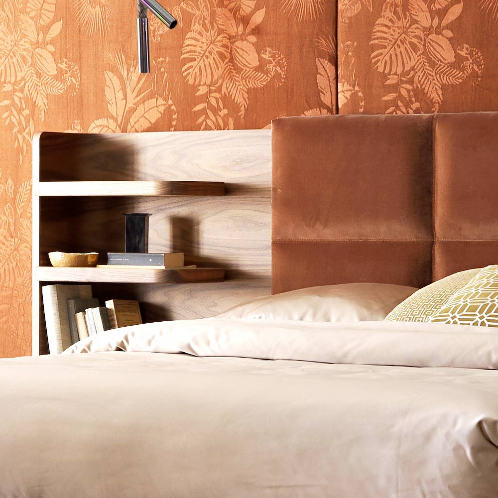 York präsentiert eine geschwungene Schichtholzstruktur, die in Canaletto-Nussbaum furniert ist. Der Bettrahmen und die Regale sind aus massivem Canaletto-Nussbaum.