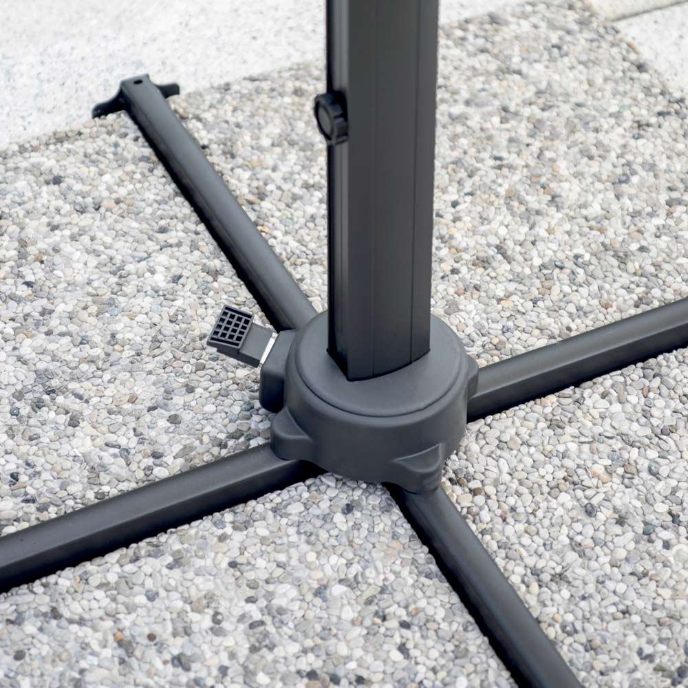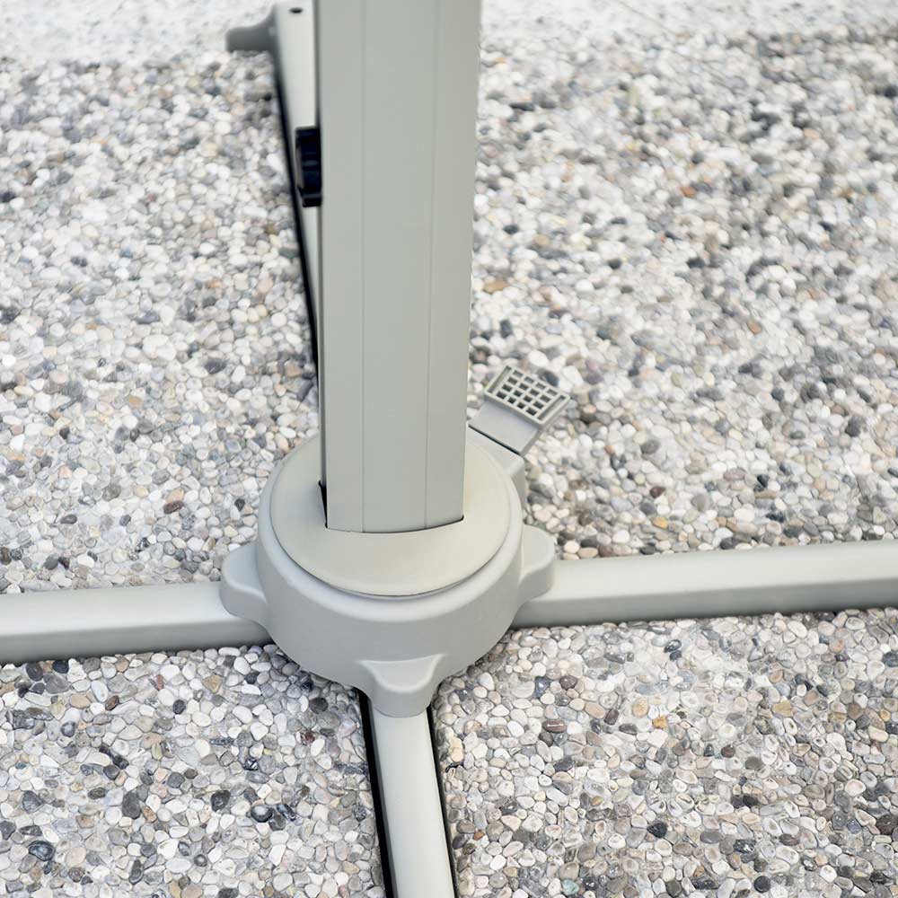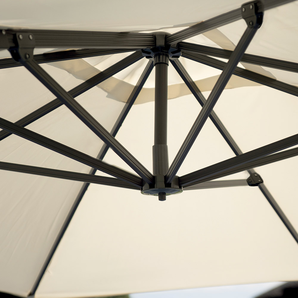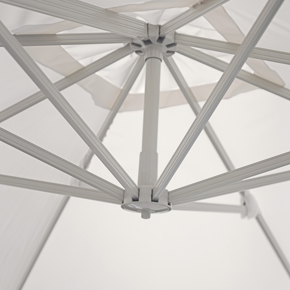 Dieser seitlich angebrachte Sonnenschirm vereint modernes Design, Funktionalität und Langlebigkeit und bietet eleganten Schutz für jeden Außenbereich. Das Aluminiumgestell mit einer 77 x 53 mm Stange und acht 14 x 24 mm Streben gewährleistet Stabilität und Robustheit und besticht gleichzeitig durch eine klare, zeitgemäße Ästhetik.
