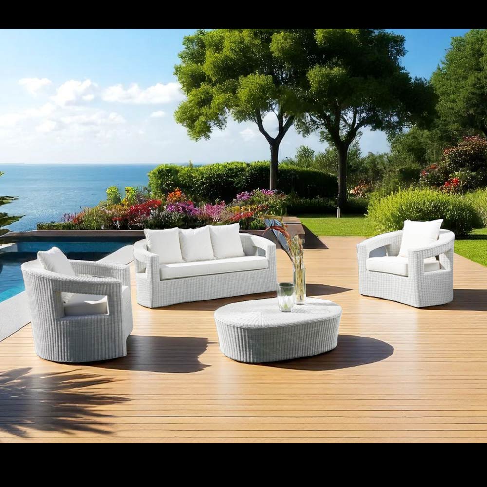 Dieses Garten-Lounge-Set mit seiner schlichten und modernen Eleganz bereichert jeden Außenbereich stilvoll. Die klaren Linien und einladenden Formen der Sofas und Sessel schaffen eine einladende Atmosphäre, ideal für Momente der Entspannung oder geselliges Beisammensein im Freien. Das Set umfasst ein bequemes Zweisitzer-Sofa und zwei Einzelsessel , jeweils ergänzt durch weiche Kissen aus wetterbeständigem Stoff, die langanhaltenden Komfort und minimalen Pflegeaufwand versprechen.