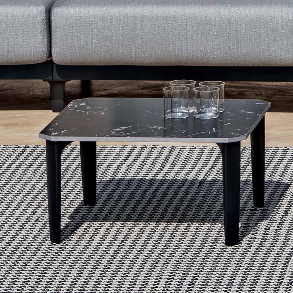 Niedriger Couchtisch im Freien aus Aluminium und quadratische Platte aus Porzellanstein, hochwertiger Artikel aus Italien.