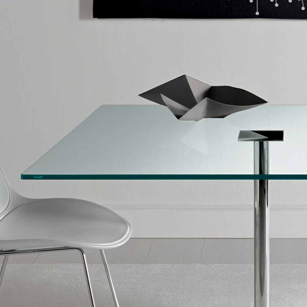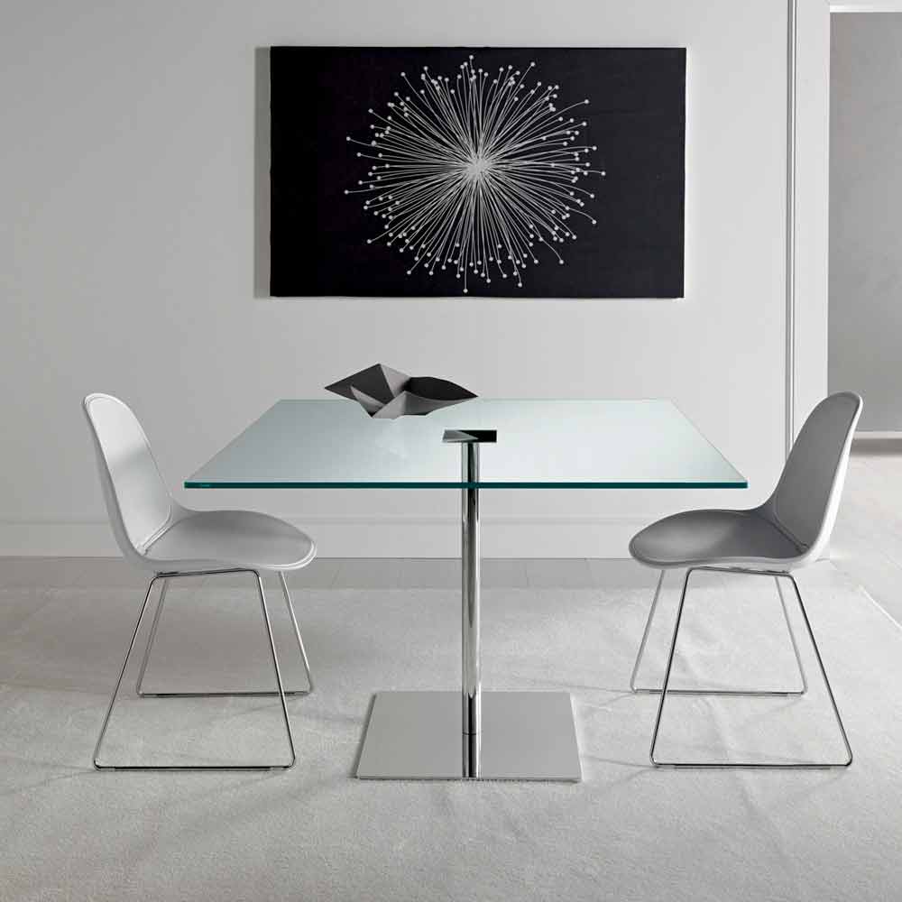 Luxuriöser quadratischer Esstisch mit extra klarer Glasplatte und verchromter Metallbasis, hergestellt in Italien.