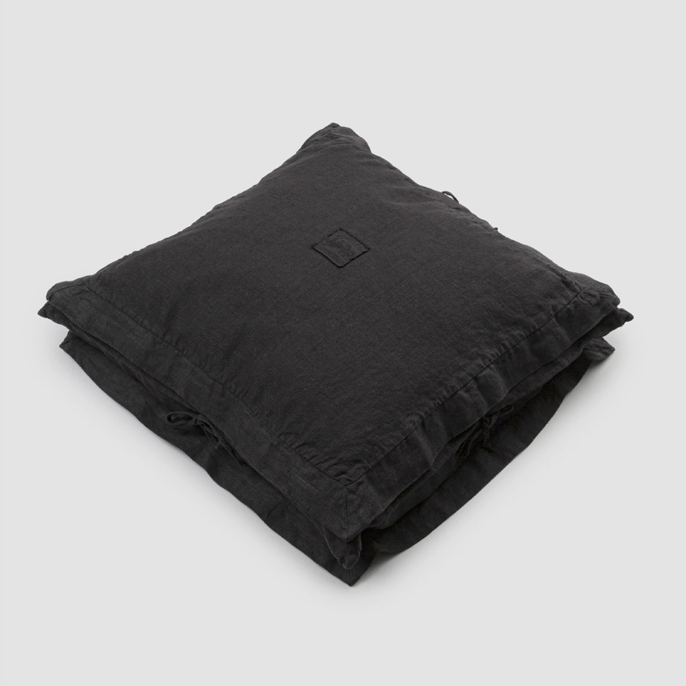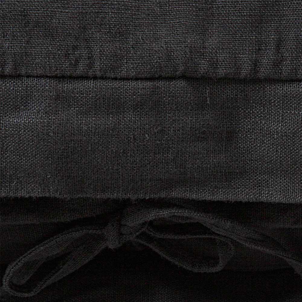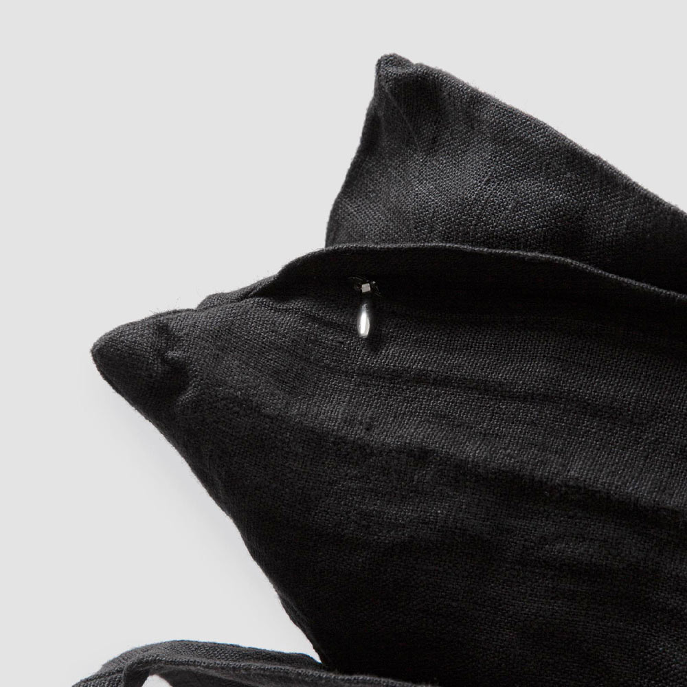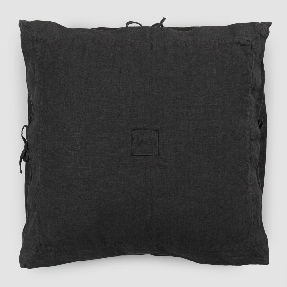 Der Wert der Tradition verbindet den modernen Lebensstil mit diesem schwarzen Kissenbezug aus schwerem Leinen mit quadratischer Dekoration und Krawatten an den Seiten.