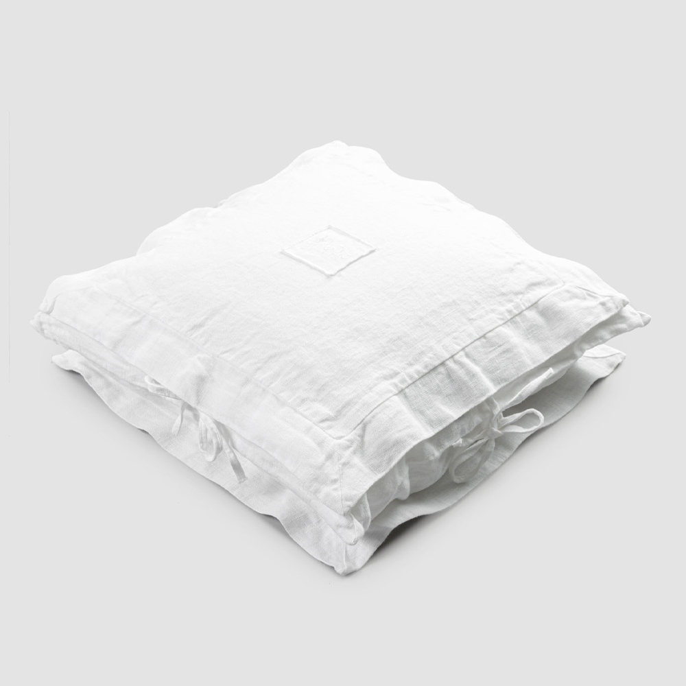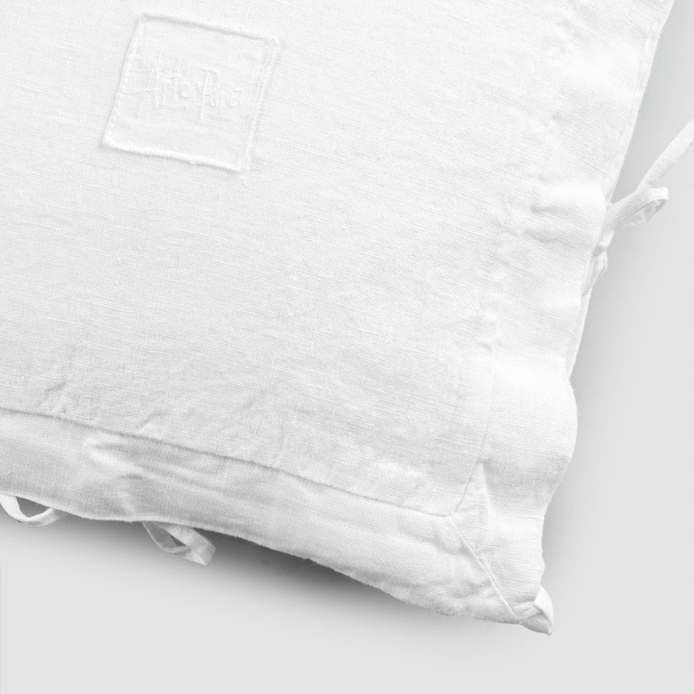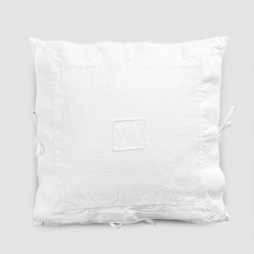 Der Wert der Tradition verbindet den modernen Lebensstil mit diesem schweren Kissenbezug aus weißem Leinen mit quadratischer Dekoration und Krawatten an den Seiten.