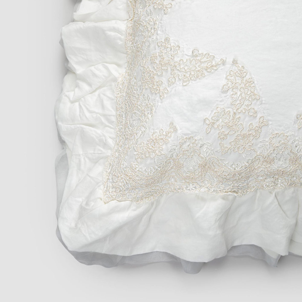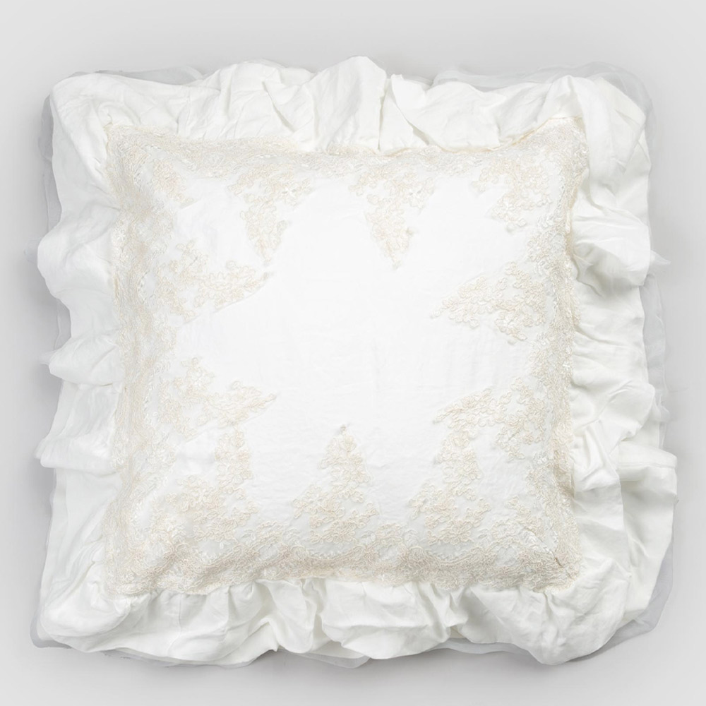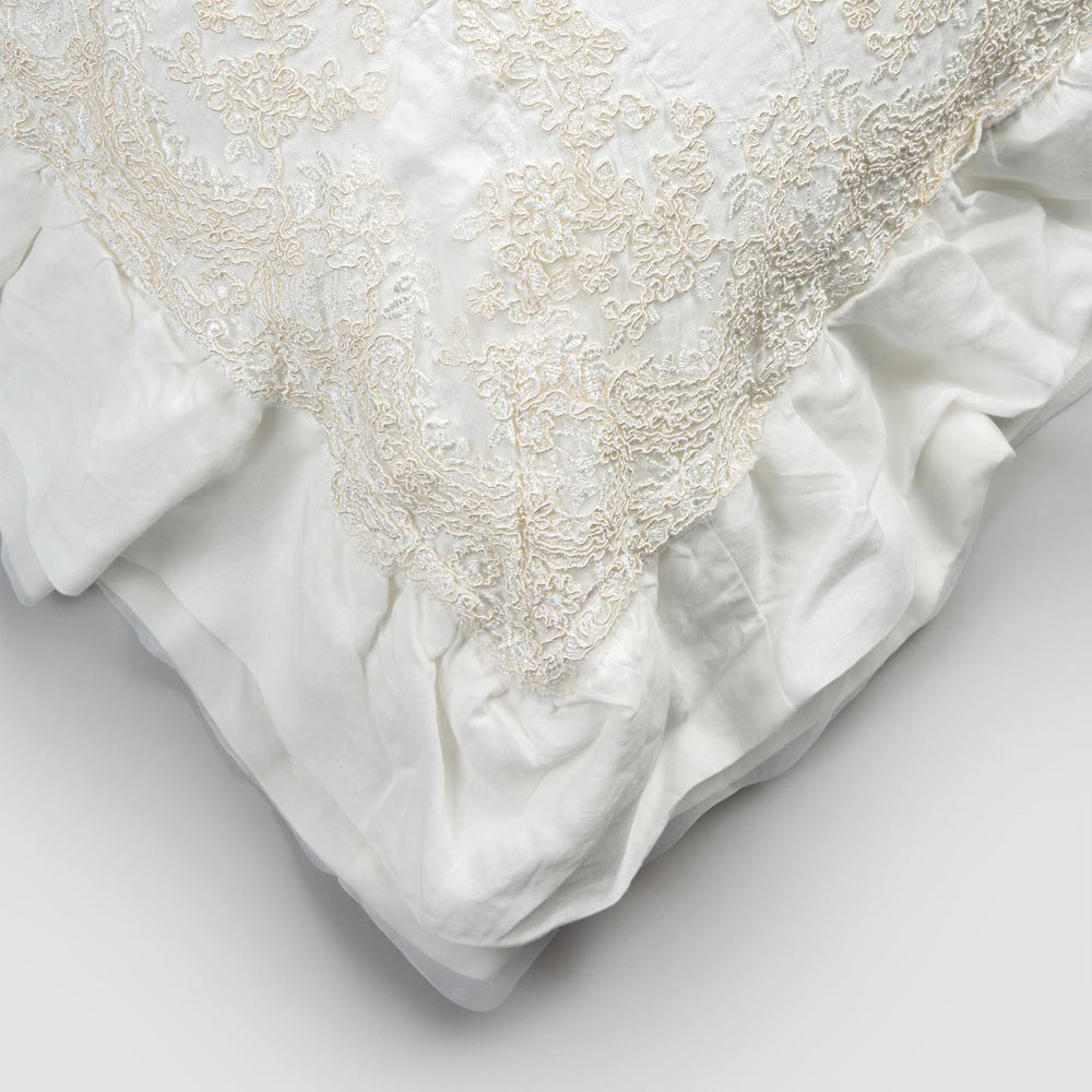 Dekorativer Kissenbezug aus natürlichem weißem Leinen mit eleganter Spitze und Volants, hergestellt in italienischer Qualität.