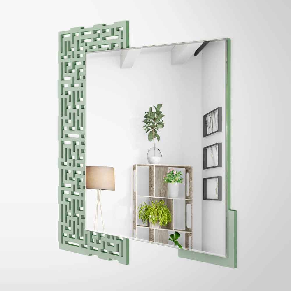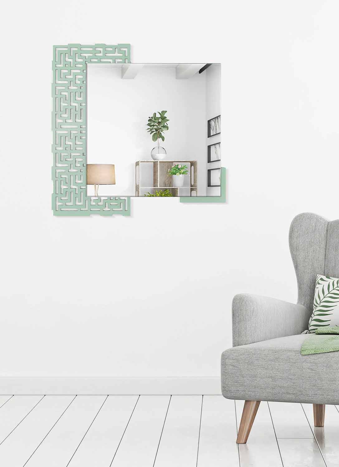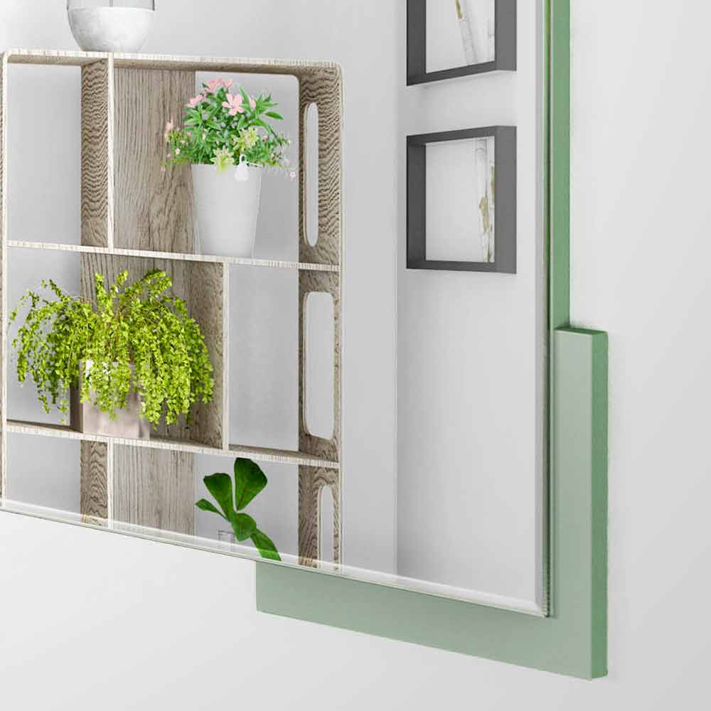 Moderner Wandspiegel, quadratisches geometrisches Design, aus grünem Holz und hergestellt in Italien.