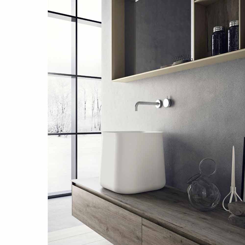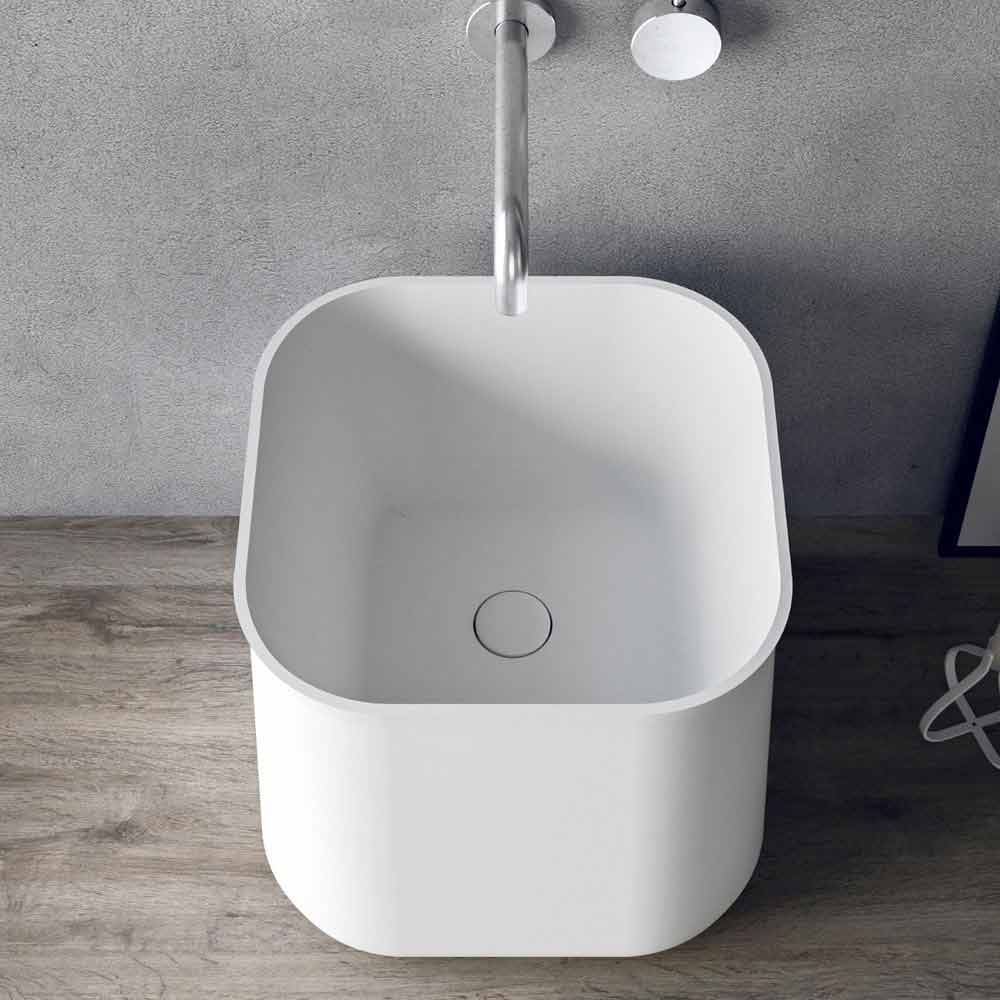 Quadratisches Waschtisch aus weißem Harz, modernes Design mit hohen Kanten.
