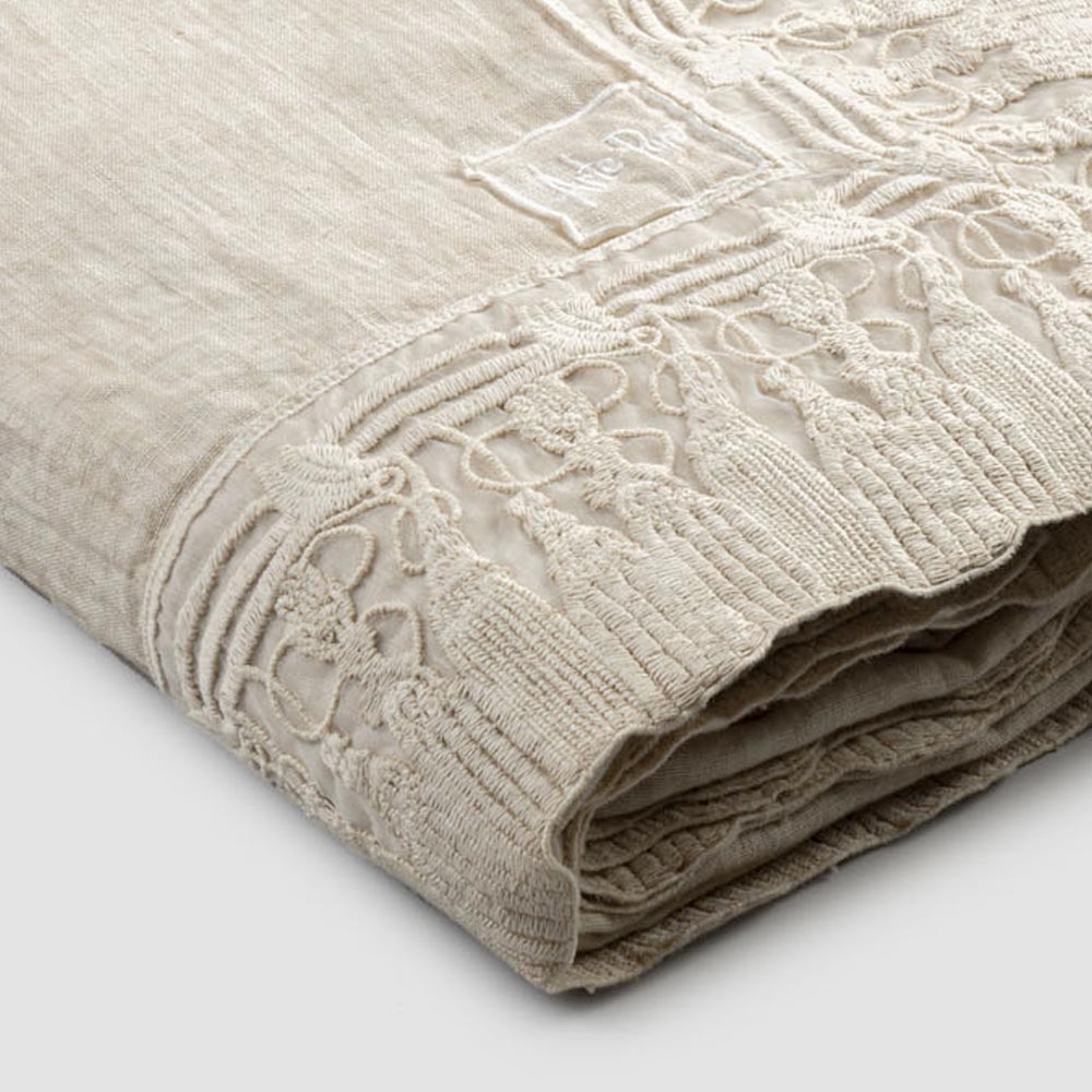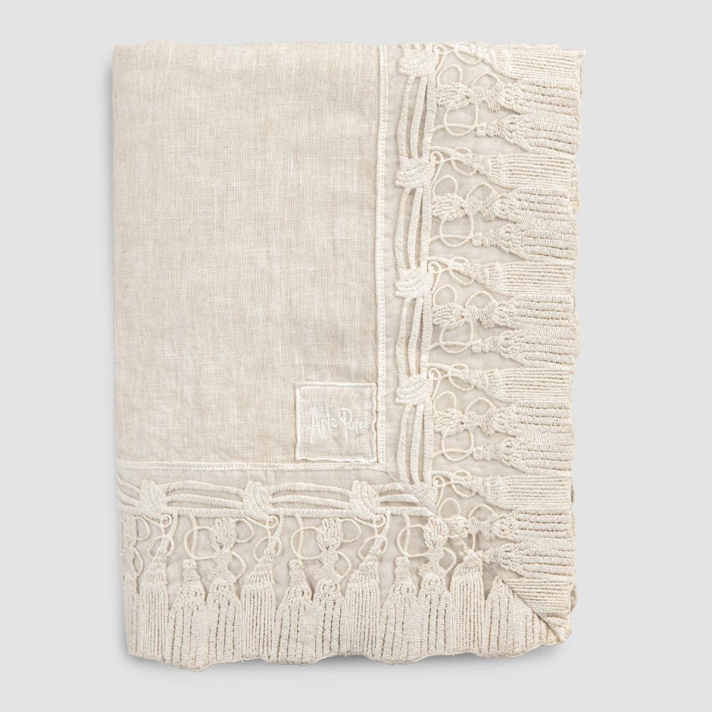 Rechteckige Leinentischdecke mit Spitzenquasten, handgefertigter Luxus made in Italy.