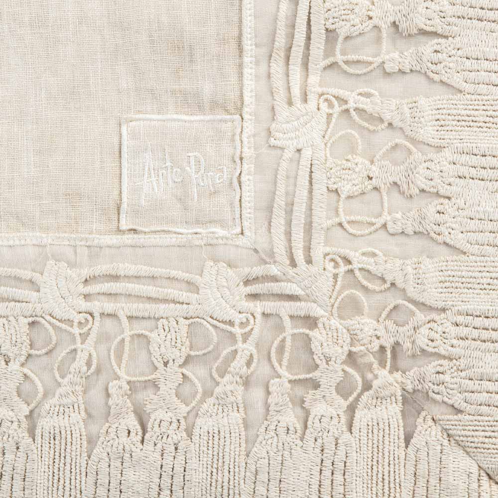 Quastenspitze , die mit einer gefalteten Kante verziert ist. Hergestellt in Italien mit hochwertigen Materialien und dank spezieller Behandlungen, die das natürliche Erscheinungsbild verbessern, weich im Griff. Ideal für den Tisch, da er apoallergen und antibakteriell ist und zusätzlich natürliche und