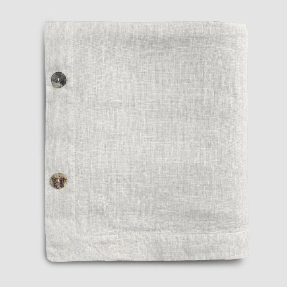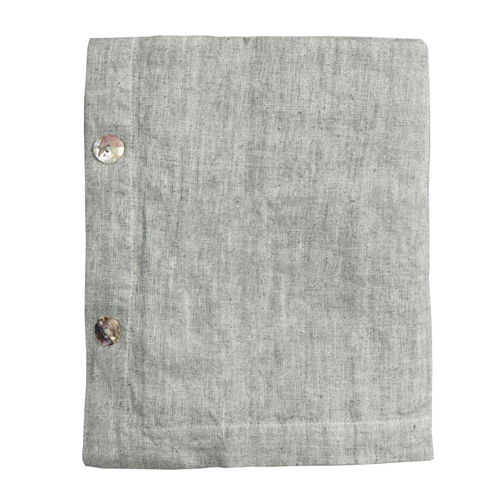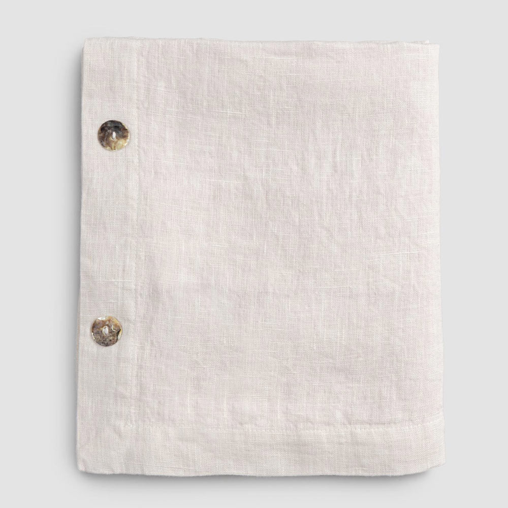 schweren Leinentischdecke, die auf einer langen Seite mit einer Reihe von Agoya-Perlmuttknöpfen verziert ist.