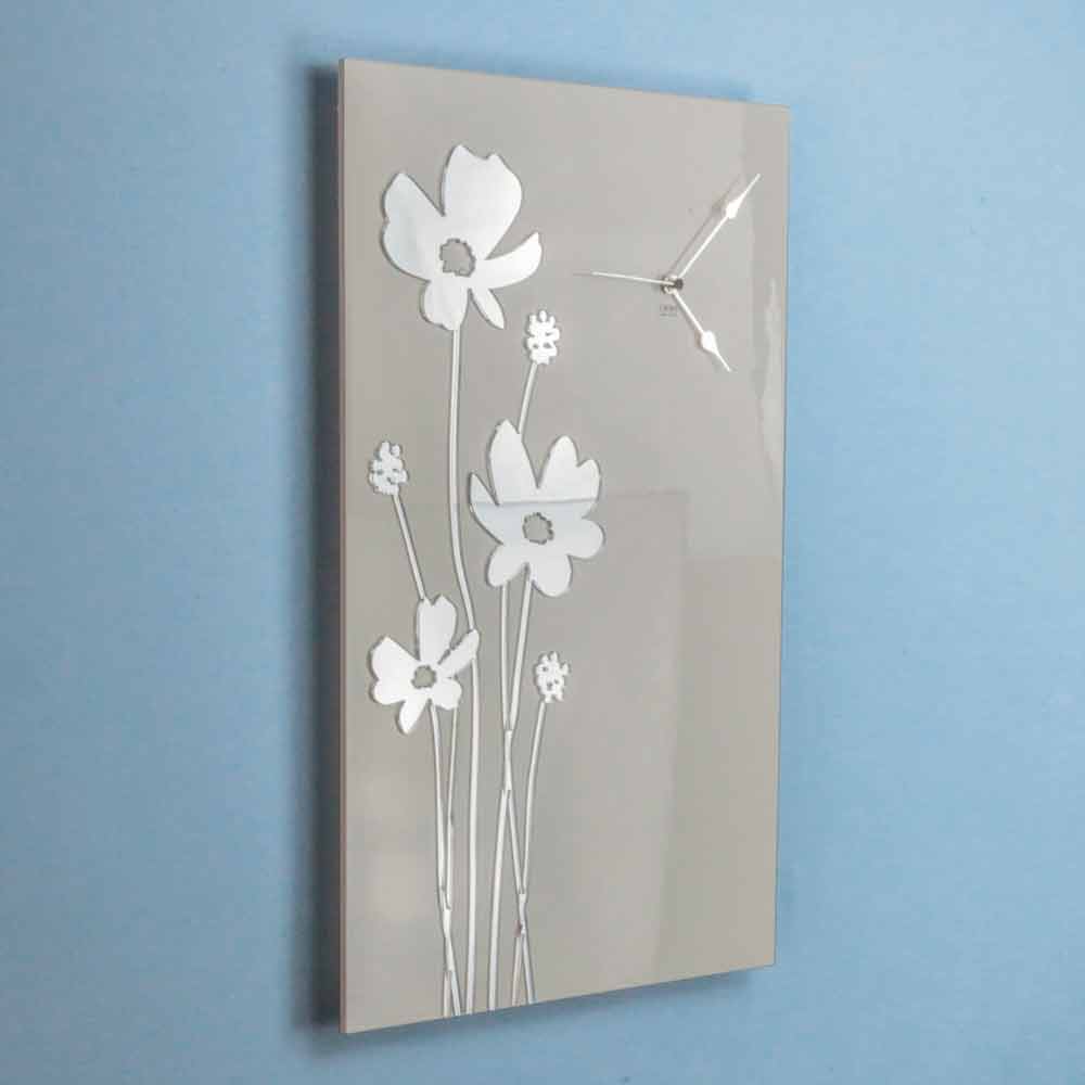 Rechteckige Wanduhr in modernem Design aus weißem Holz mit eingelegten Plexiglas-Spiegeln, hergestellt in Italien.