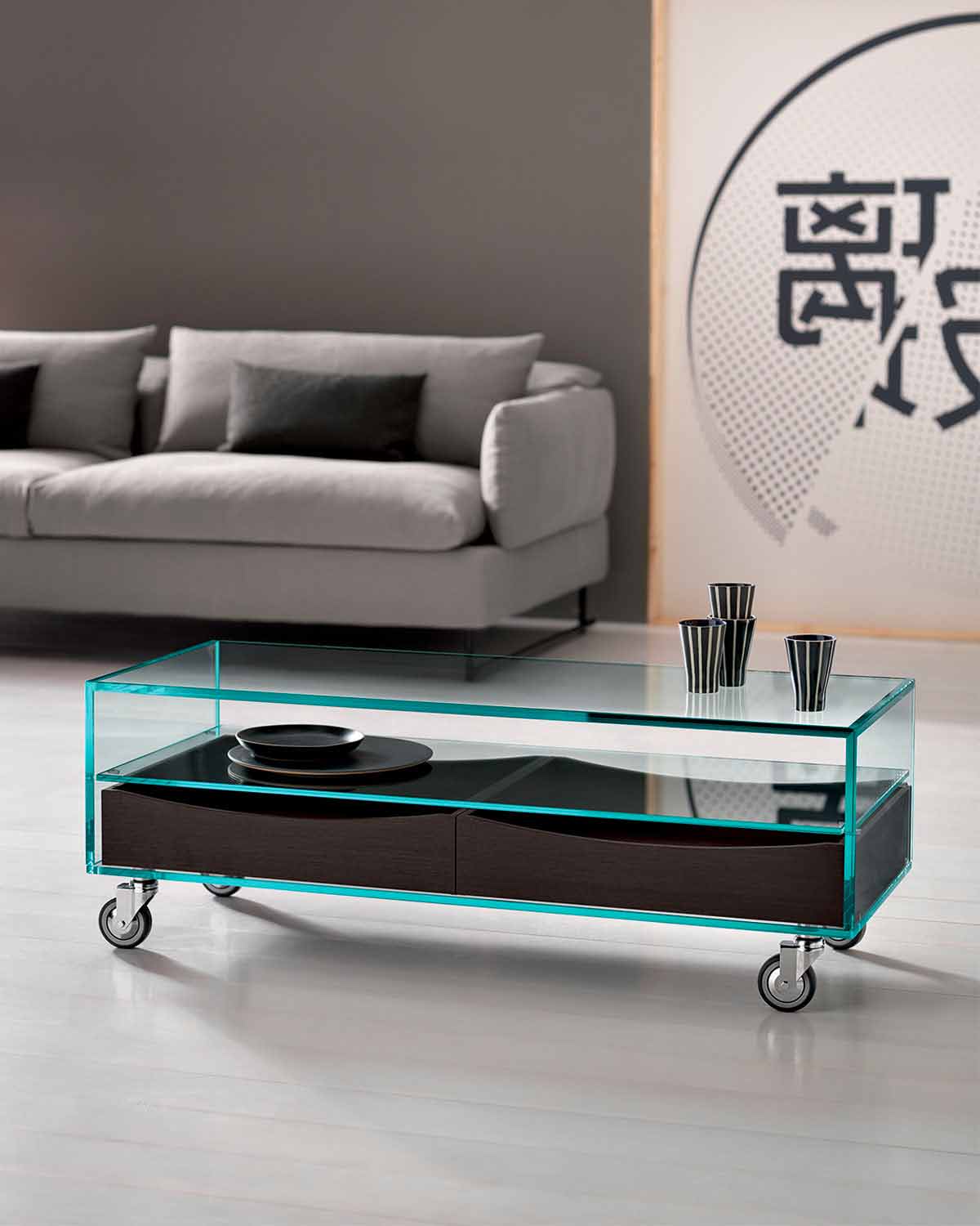Wohnzimmer Couchtisch im modernen Stil auf Rädern aus extraklarem Glas mit zwei Schubladen aus Wengè-Holz, Made in Italy.