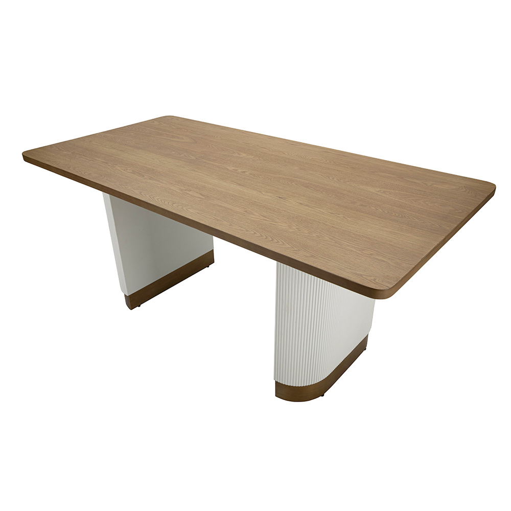 Dieser Esstisch ist eine tadellose Synthese aus Stil und Funktionalität , ein Möbelstück, das mit seiner diskreten und doch unverwechselbaren Präsenz jede Umgebung bereichert. Die MDF-Oberfläche in warmen Naturtönen kontrastiert harmonisch mit der weißen Basis mit vertikalen Rillen und bietet eine raffinierte visuelle Textur und ein Design, das von den Elementen der klassischen Architektur inspiriert ist.