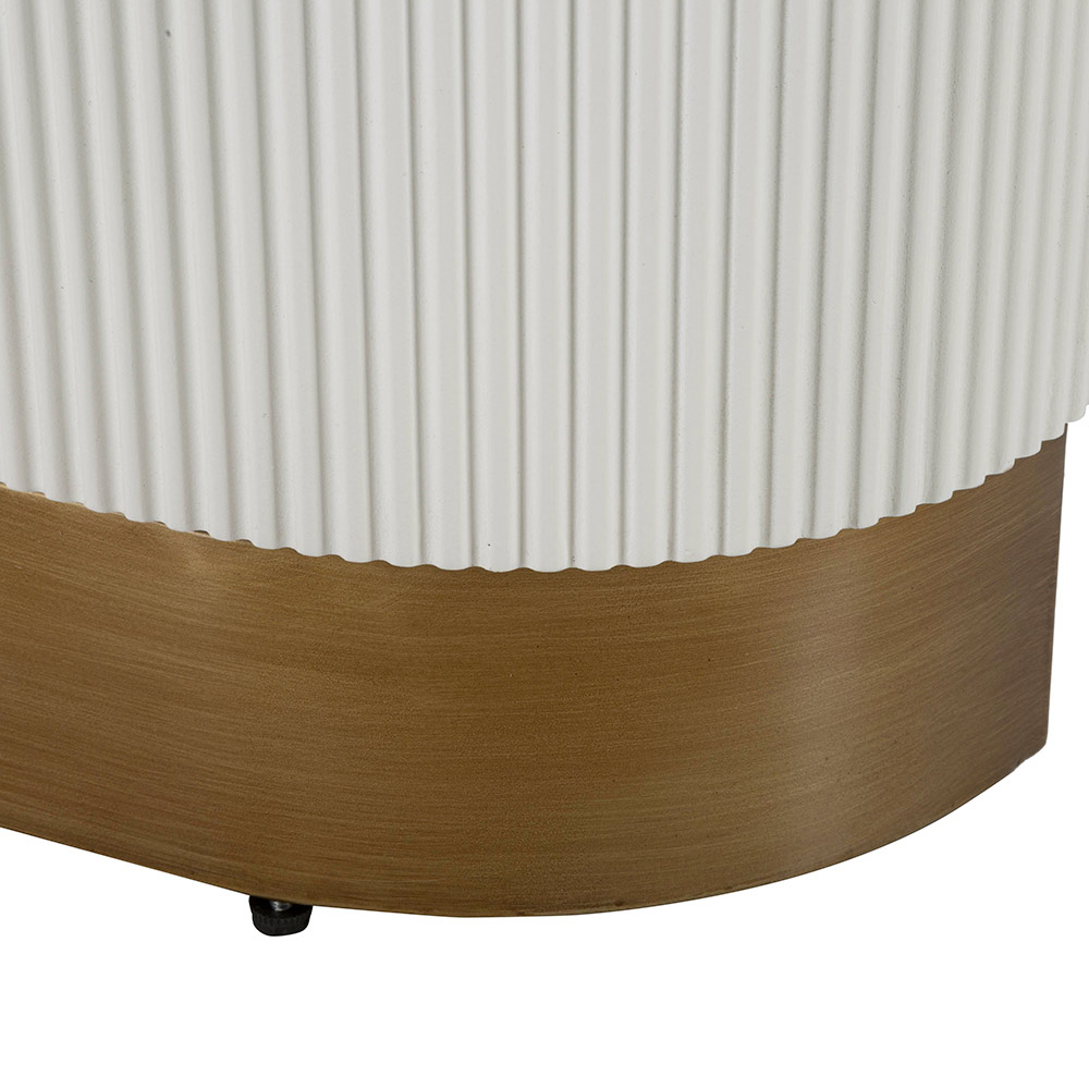 Innentisch aus weißem MDF und braunem Eschenholz mit abgerundetem Design und feiner Verzierung mit erhabenen Linien.