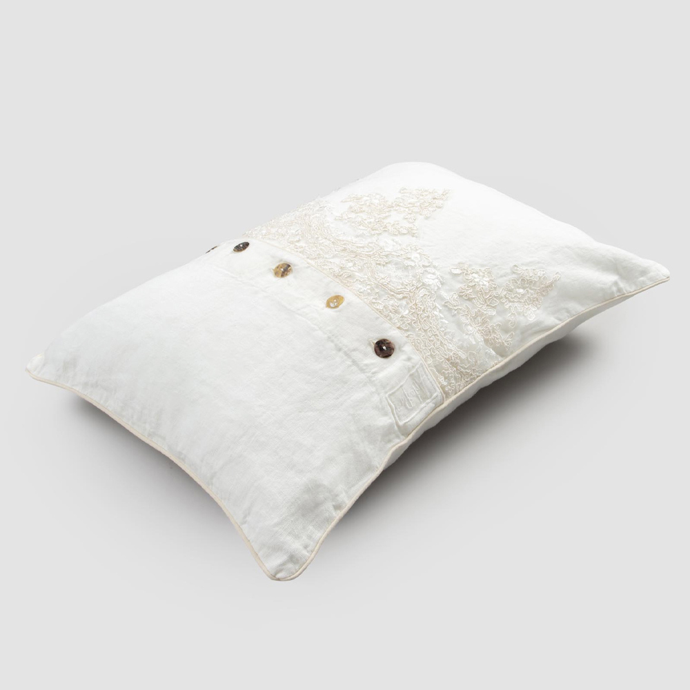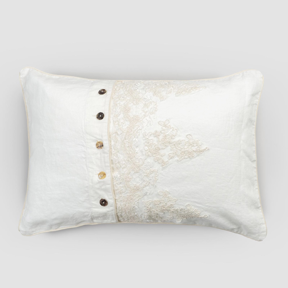 Kissenbezug aus weißem Leinen mit eleganter Spitze, zentralen Knöpfen und Paspeln, Luxus made in Italy.