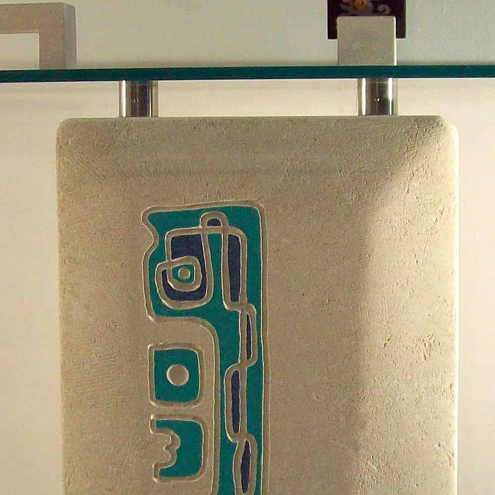 Die Basis ist aus Naturstein aus Vicenza hergestellt und wird von Hand bearbeitet. Die Tischplatte besteht aus Kristall float mit einer Dicke von 15 mm und ist an dem Stein mit zwei Flanschen befestigt.