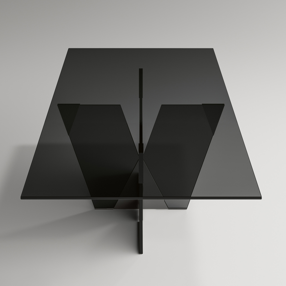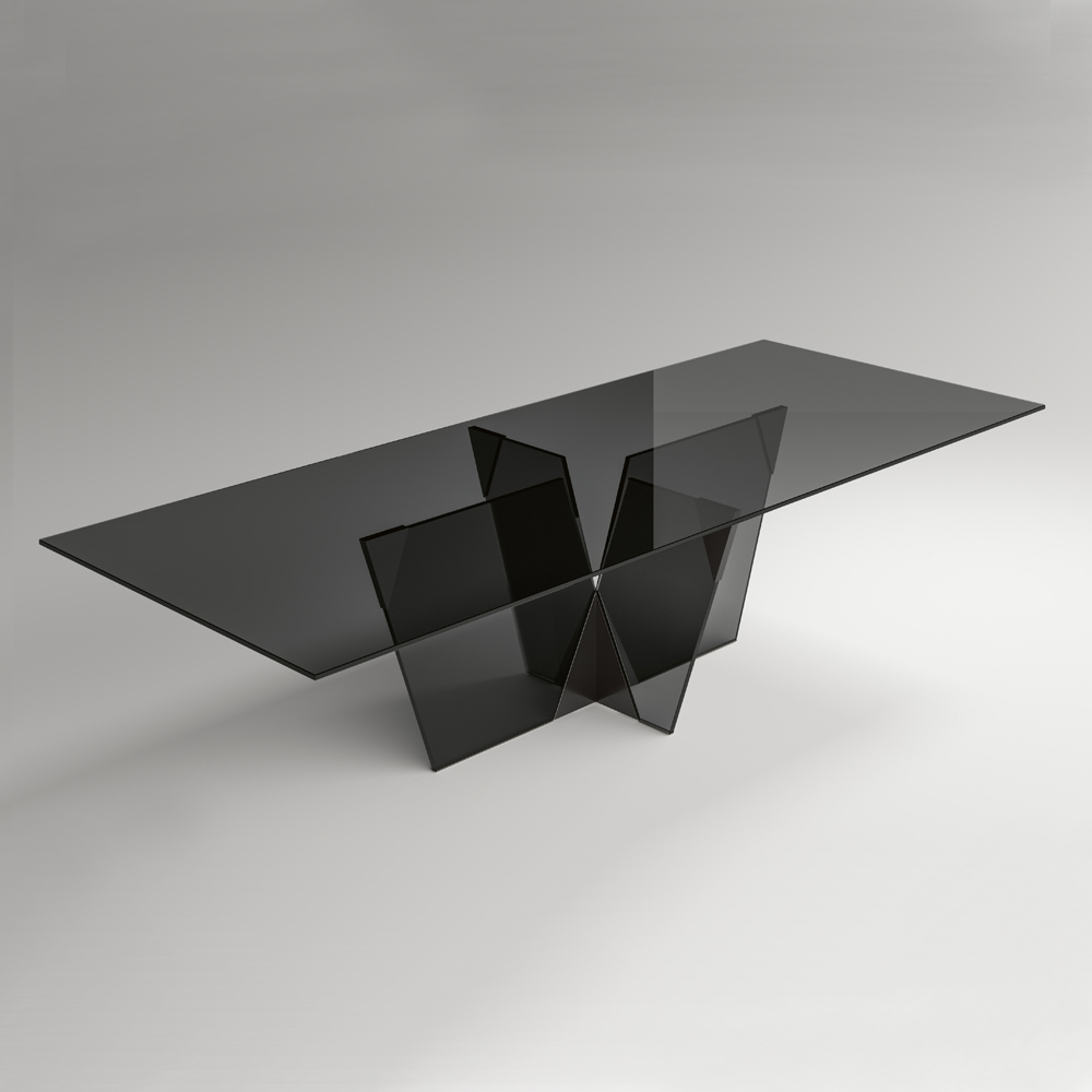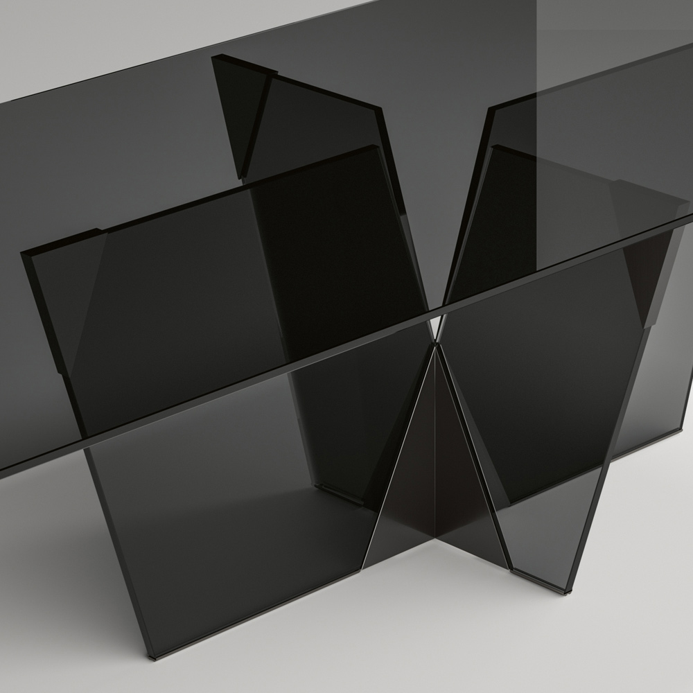 elegante und skulpturale Struktur , entsteht dieses Möbelstück aus der Kombination von Materialien unterschiedlicher Natur zusammen mit der Leidenschaft für die Glasverarbeitung und schafft es so, durch verschiedene Formen und Dicken eine Darstellung von Stärke und Charakter zu definieren. Die Stärke seiner Ästhetik ist die architektonische Basis, die durch eine pyramidenförmige Verbindung aus Metall gekennzeichnet ist, die den wesentlichen Teil des Produkts darstellt. Die Metallelemente vervollständigen das Design des Tisches, geben dem Glas des Untergestells Form und bereichern es mit Persönlichkeit und Originalität.