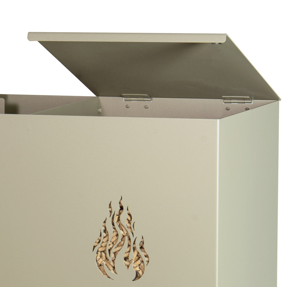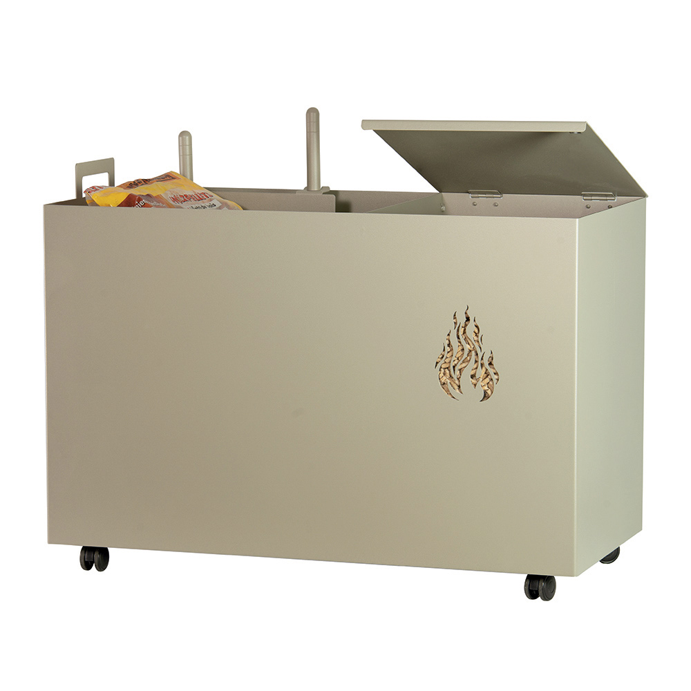 Dieser Kamin-Pelletwagen ist eine ideale Lösung für alle, die eine elegante und praktische Möglichkeit zur Pelletslagerung suchen. Die robuste Struktur und das moderne Design passen perfekt in jeden Einrichtungsstil. Das Flammensymbol auf der Vorderseite ist ein dekoratives Detail, das die Funktion des Trolleys unterstreicht und ihn sofort erkennbar macht.