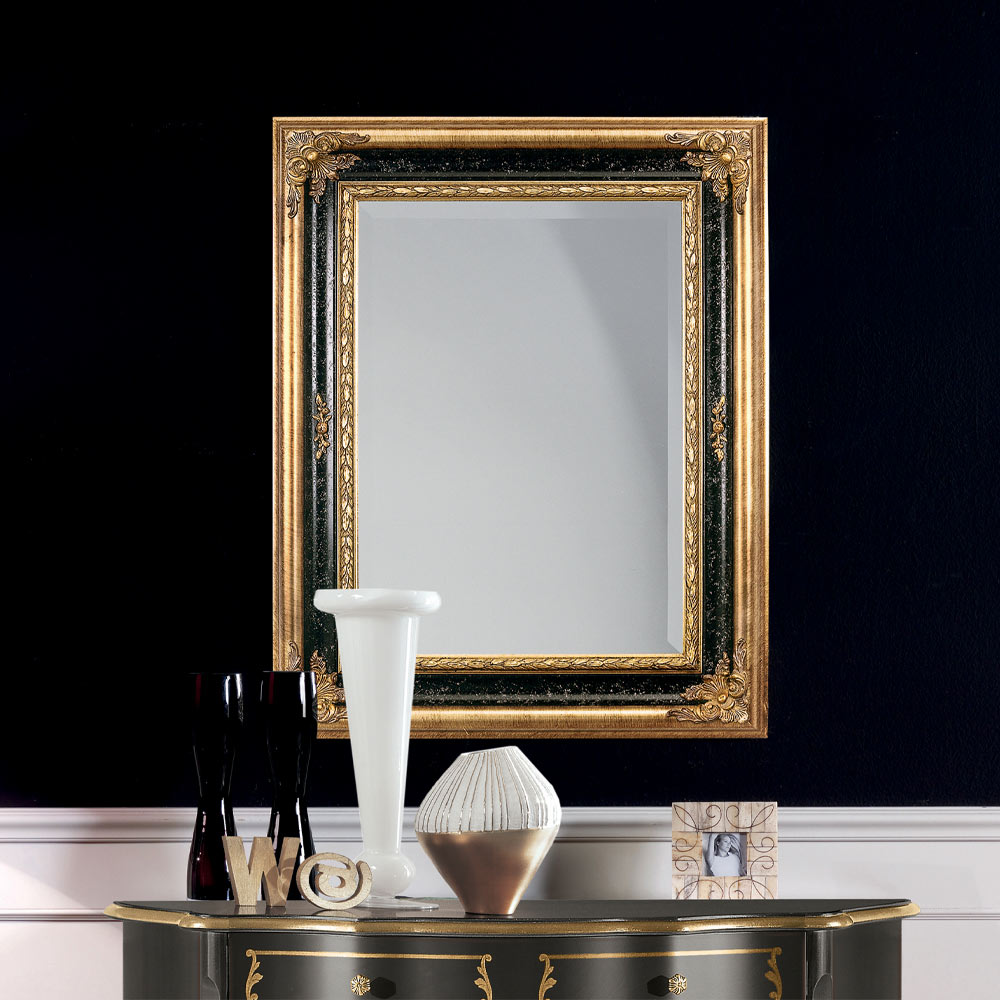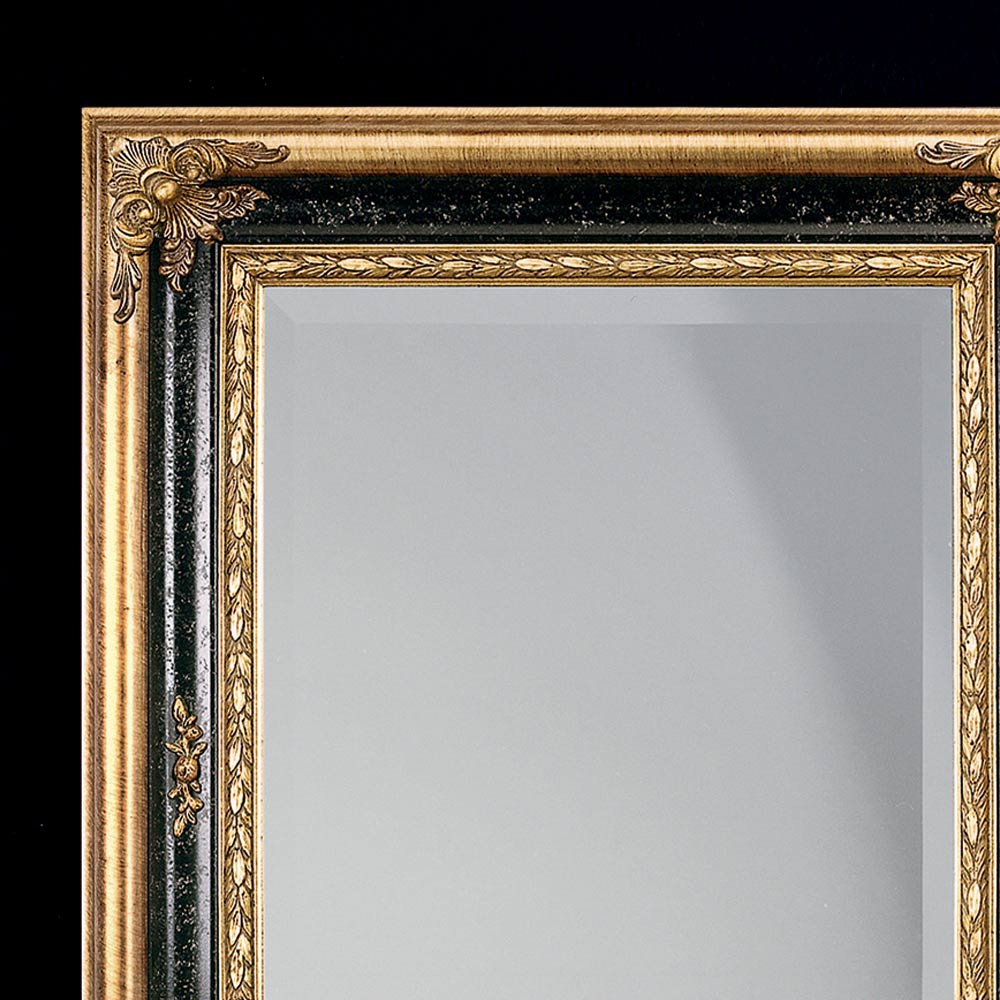 Eleganter rechteckiger Spiegel mit Holzrahmen, verziert mit Blattgold und schwarzem Lack. Dank seines klassischen Stils ist dieser Spiegel ideal, um jedem Raum eine elegante und luxuriöse Note zu verleihen.