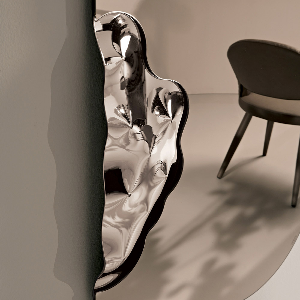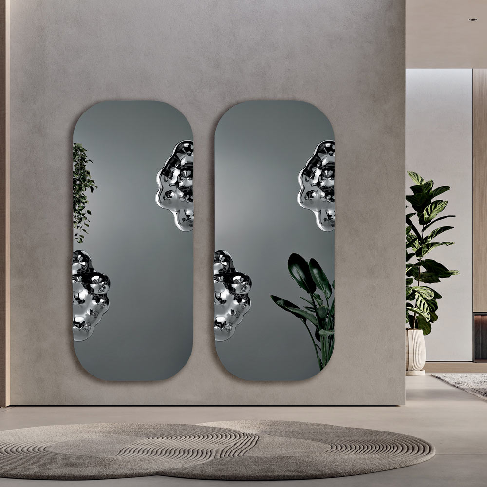 Die rechteckige Fläche mit abgerundeten Ecken verleiht der Komposition Ausgewogenheit und optische Leichtigkeit. Zwei Ton-in-Ton-Elemente aus strukturiertem Glas sind symmetrisch an den vertikalen Seiten des Spiegels angebracht und verleihen dem Design Struktur und Tiefe. So entsteht ein eleganter Kontrast zwischen glatten Oberflächen und aufwendigen Texturen.