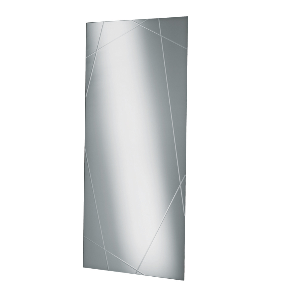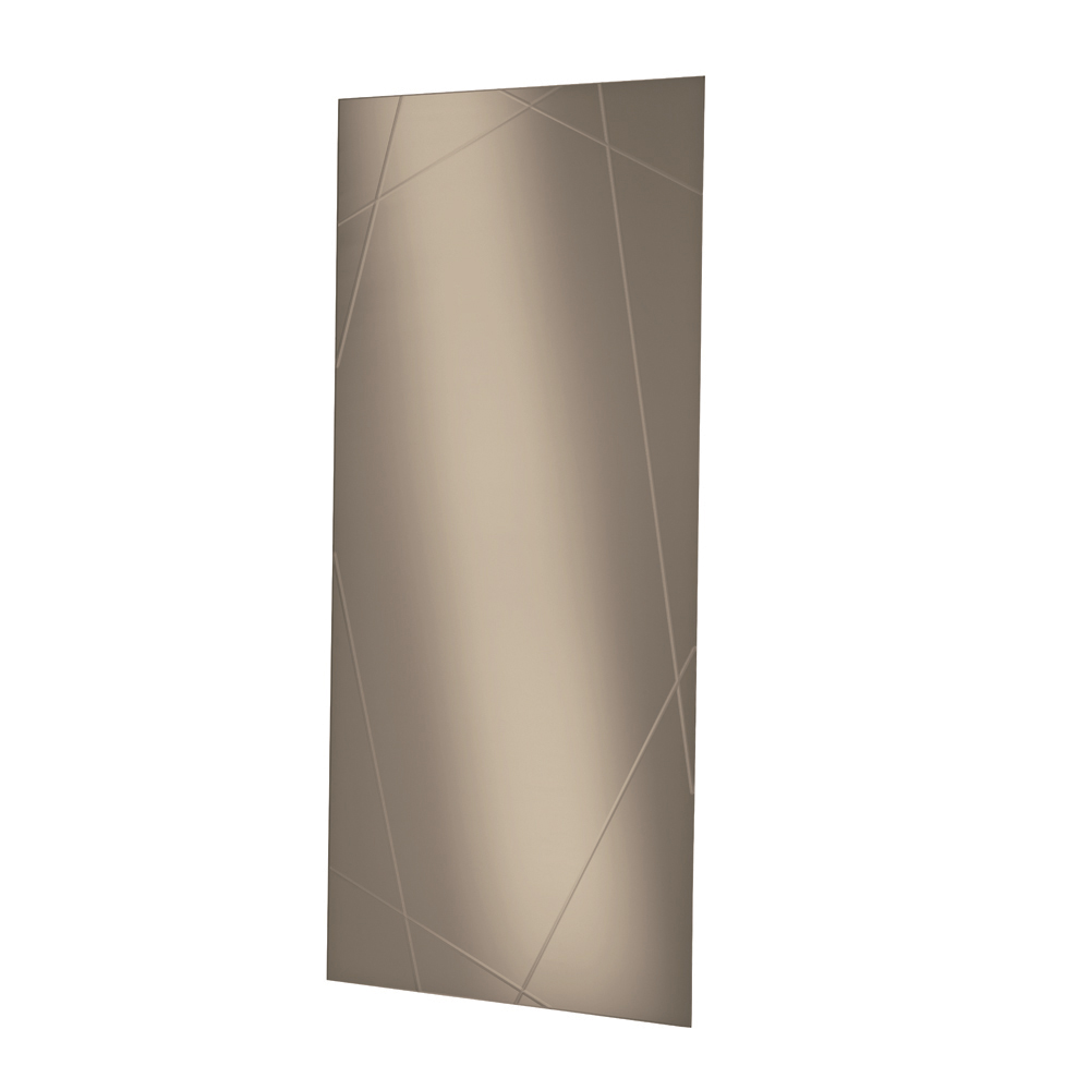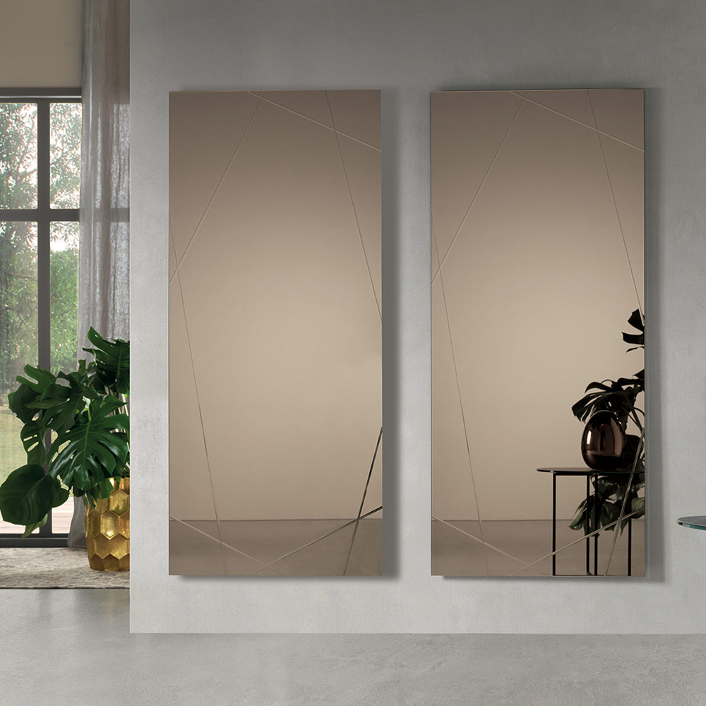 Der Spiegel ist rechteckig, 4 mm dick und mit lasergeschnittenen Gravuren versehen, die ein elegantes geometrisches Muster auf der Oberfläche bilden. Dieses dekorative Detail erzeugt ein raffiniertes Spiel von Licht und Reflexionen und verleiht dem Spiegel Tiefe und Charakter.