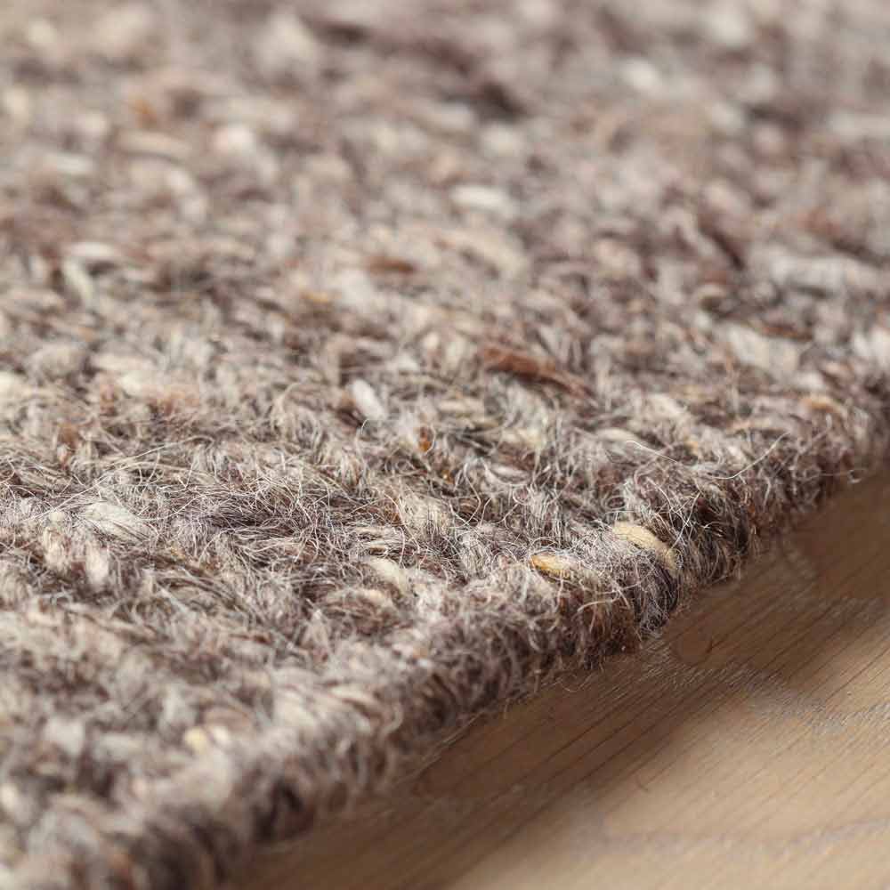 Die charakteristischen Merkmale dieser Teppichlinie sind die natürliche Kompaktheit und das dicke Wollgewebe mit faserigen und vollmundigen Texturen, die sich in einem flachen, organischen Schnittpunkt in brauner oder cremefarbener Farbe gegenseitig verfolgen.