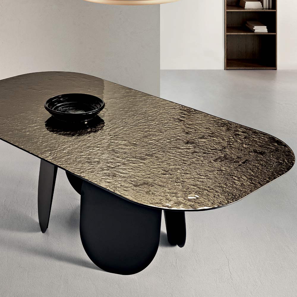 Die rückseitig versilberte, gehämmert Glasplatte verleiht dem Tisch Helligkeit und optische Tiefe. Ihre strukturierte Oberfläche reflektiert das Licht mit irisierenden Effekten. Die abgerundeten Ecken der Platte verleihen dem Tisch eine weichere Silhouette und machen ihn einladender – perfekt für gesellige Stunden.