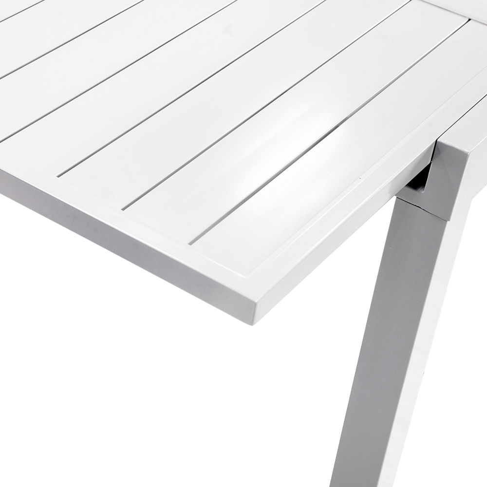 Dieser ausziehbare Aluminiumtisch zeichnet sich durch ein klares und modernes Design aus, ideal für alle, die eine vielseitige und langlebige Lösung für Außenbereiche suchen. Dieser Tisch bietet nicht nur eine robuste und leicht zu reinigende Oberfläche, sondern auch eine Ästhetik, die perfekt zu jedem Stil von Außenmöbeln passt.