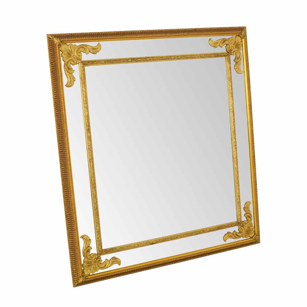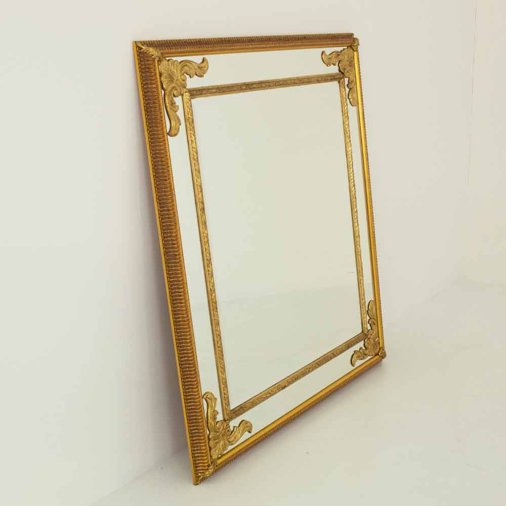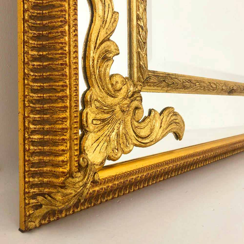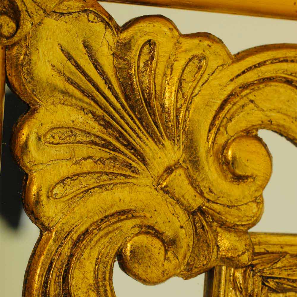Dieser prächtige Spiegel ist ein Triumph klassischer Eleganz , ein wahres Schmuckstück für Ihr Zuhause, das Funktionalität mit purer ästhetischer Pracht verbindet . Sein reichhaltiges und kompliziertes Design fängt die Essenz von Luxus ein, wobei jede Schriftrolle und jede Schnitzerei mit fein aufgetragener Vergoldung glänzt und an die Opulenz historischer italienischer Häuser erinnert.