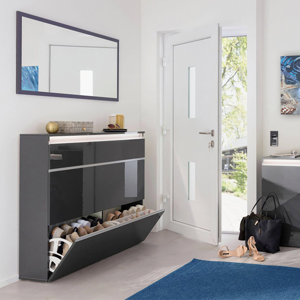 nachhaltigen Melamin-Holzplatte und ist lackiert und glänzend in zwei Ausführungen erhältlich.