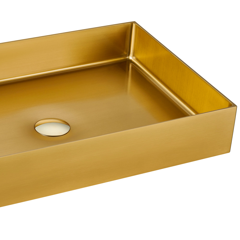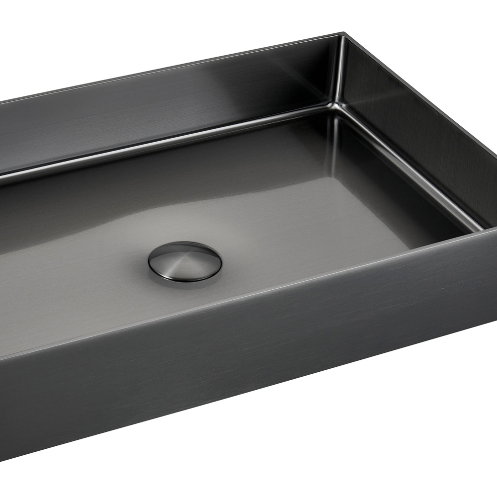 Das rechteckige Aufsatzwaschbecken aus 3 mm starkem Edelstahl SUS 304 ist ein Juwel an Design und Funktionalität. Es ist aus einem einzigen Metallblech gefertigt und bietet eine klare, moderne Ästhetik. Die Endbearbeitung der PVD+Nano-Beschichtung in Kombination mit sorgfältigem Bürsten verleiht dem Objekt ein attraktives und fast rätselhaftes Aussehen und verbessert den Glanz sowie die Widerstandsfähigkeit gegen Flecken und Kratzer. Das Design zeichnet sich durch ausgewogene Formen und ideale Proportionen aus in drei Ausführungen , die sich elegant an jede Umgebung anpassen. Darüber hinaus machen raffinierte Details wie die mitgelieferte passende Ablaufabdeckung und der völlige Verzicht auf sichtbare Schweißnähte dieses Waschbecken zu einem wahren Meisterwerk der Handwerkskunst und des Designs und machen es zu einem herausragenden Stück für Badezimmer mit luxuriösem und modernem Flair.