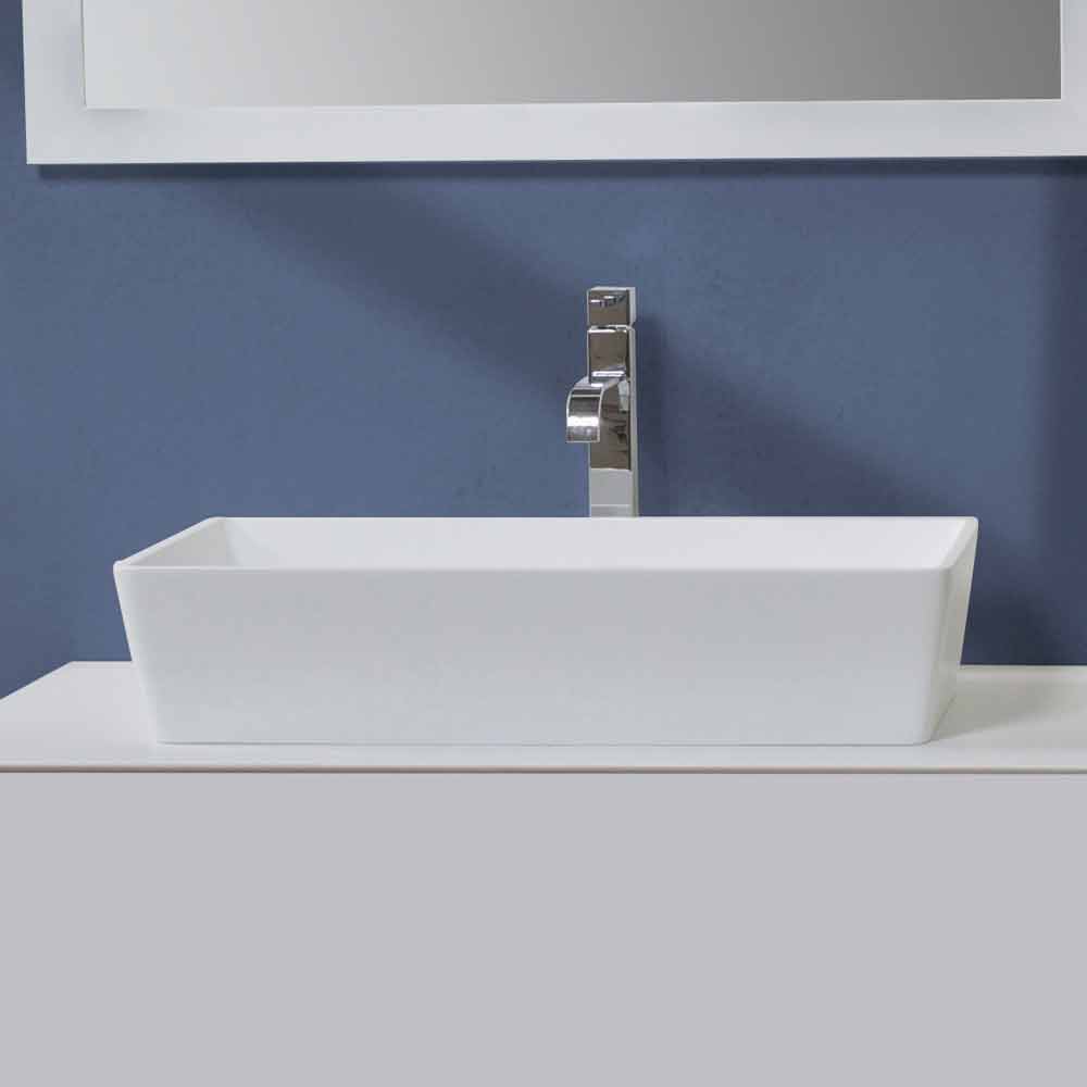 Rechteckiges Aufsatzwaschbecken aus weißem Harz in Optik.