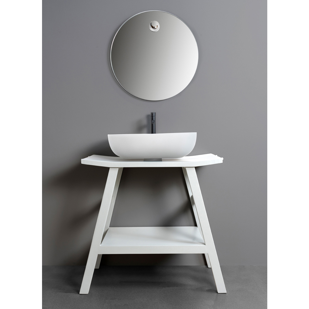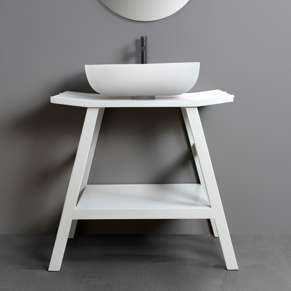 Freistehender Badezimmerschrank aus natürlich wiedergewonnenem Teakholz , matt weiß lackiert, ein reiner und eleganter Farbton , der an die schillernde Reflexion von Schnee in der Sonne erinnert und perfekt zum Teakholz passt, um ein Ergebnis mit einer starken szenografischen Persönlichkeit zu erzielen. Seine Struktur zeichnet sich durch die leicht geschwungene Form der Platte aus, die der Ästhetik des Produkts eine exklusive und raffinierte Note verleiht. Komplett mit 4 praktischen Handtuchhaken und funktionaler Ablagefläche .