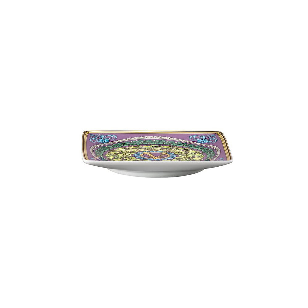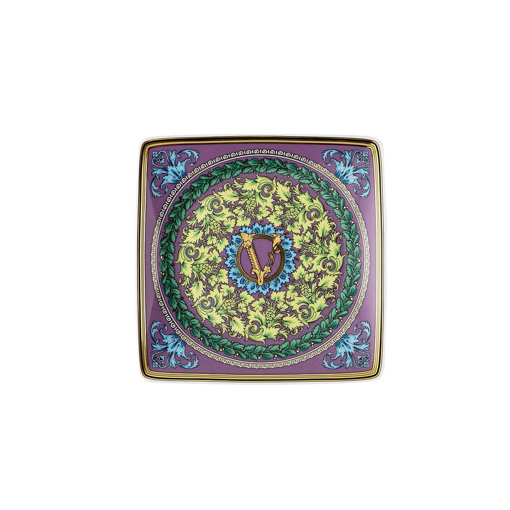 Die Barocco Mosaic-Schale von Versace aus feinem Porzellan ist eine atemberaubende Hommage an italienische Kunst und Luxus . Ihr fesselndes Design zeichnet sich durch ein kompliziertes Barockmosaik aus, angereichert mit lebhaften Violett-, Grün- und Blautönen, die sich harmonisch um das zentrale Versace-„V“ schlingen. Symbol, ein Sinnbild für Eleganz und Vornehmheit.