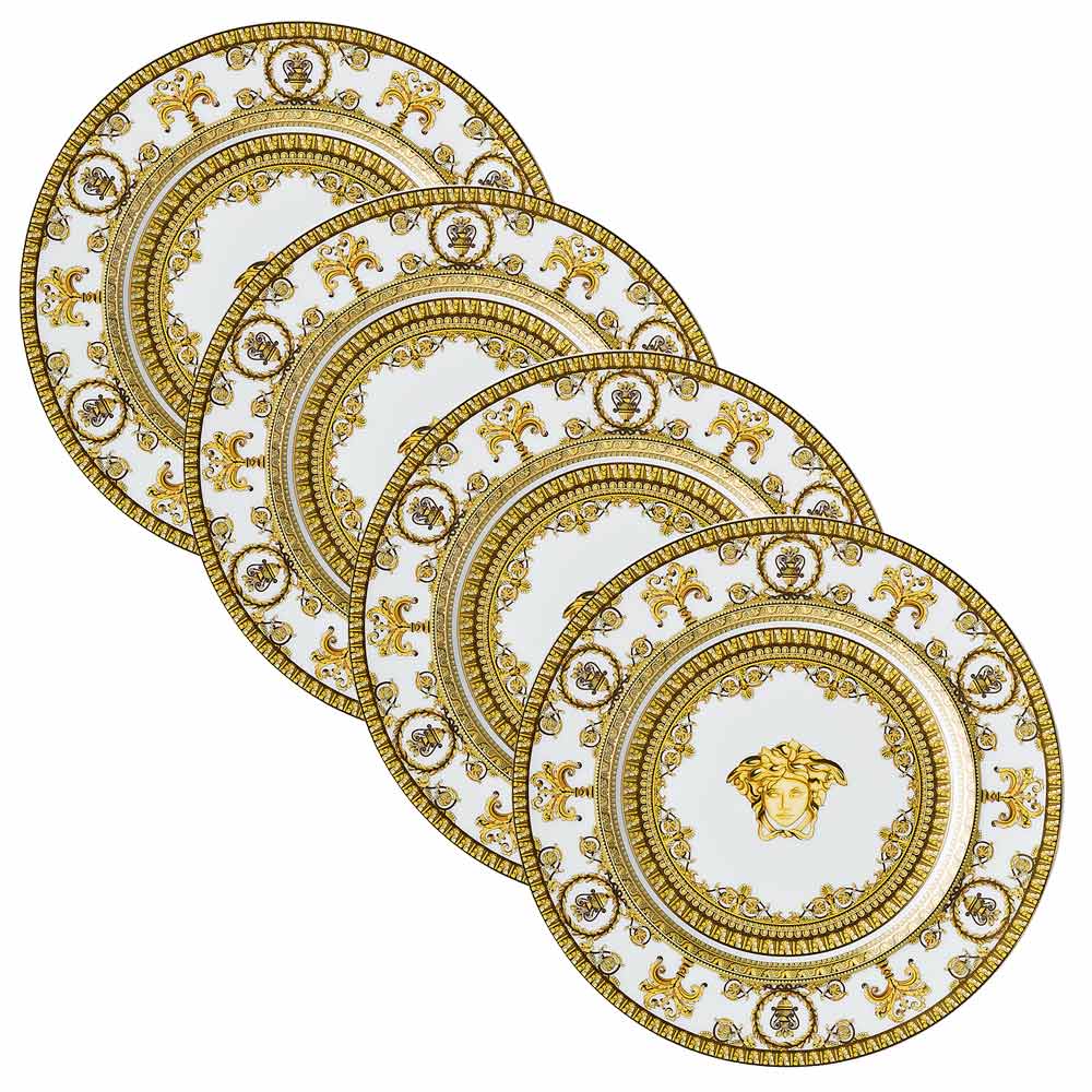 Der Versace I Love Baroque Brotteller aus feinem Porzellan ist eine Ode an die zeitlose Eleganz und Opulenz, die für das Haus typisch ist. Das aufwendige Design zeigt goldene Barockmotive, die sich elegant auf schwarzem oder weißem Hintergrund verflechten und einen Kontrast erzeugen, der das ikonische Medusa -Gesicht in der Mitte hervorhebt. Jedes Detail ist eine Hommage an den Luxus und die Handwerkskunst von Versace .