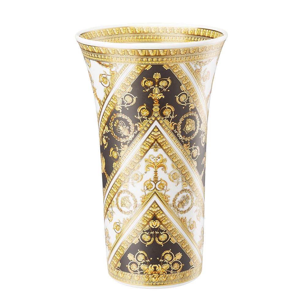 Die Vase I Love Baroque von Versace aus feinem Porzellan ist ein perfekter Ausdruck von zeitlosem Luxus und Raffinesse . Ihr raffiniertes Design zeichnet sich durch goldene Barockmotive aus, die sich auf einem schwarz-weißen Hintergrund verflechten und einen eleganten und fesselnden Kontrast bilden. Jedes Detail, von den ornamentalen Friesen bis zum ikonischen Medusa- Symbol, spiegelt die Exzellenz und Handwerkskunst des Hauses wider.