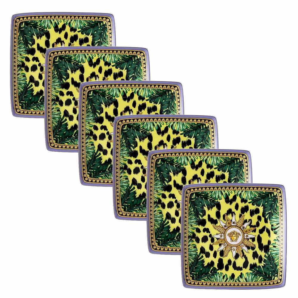 Die Jungle Animalier Tasse von Versace aus feinem Porzellan ist eine Explosion von Stil und wildem Luxus . Ihr auffälliges Design kombiniert ein lebendiges Animalier-Motiv auf gelbem Hintergrund, umrahmt von üppigen tropischen Blättern und dominiert vom ikonischen Medusa -Symbol, gesetzt in goldener Sonne und verziert mit barocken Details.