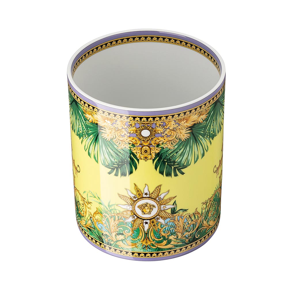 Die Jungle Animalier Vase von Versace aus feinem Porzellan ist ein Meisterwerk, das exotische Eleganz und zeitlosen Luxus vereint. Das atemberaubende Design zeichnet sich durch ein leuchtendes Gelb aus, geschmückt mit tropischen Motiven aus üppigem Blattwerk und aufwendigen barocken Details, alles umrahmt vom legendären Medusa -Symbol in der Mitte, in eine strahlende Sonne eingebettet und mit goldenen Details verziert.